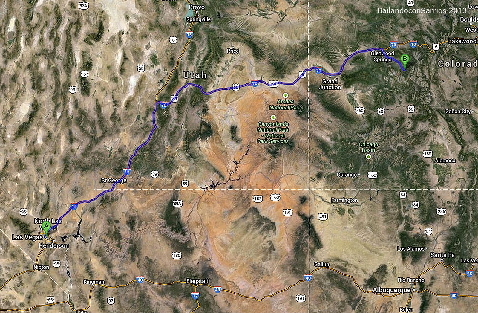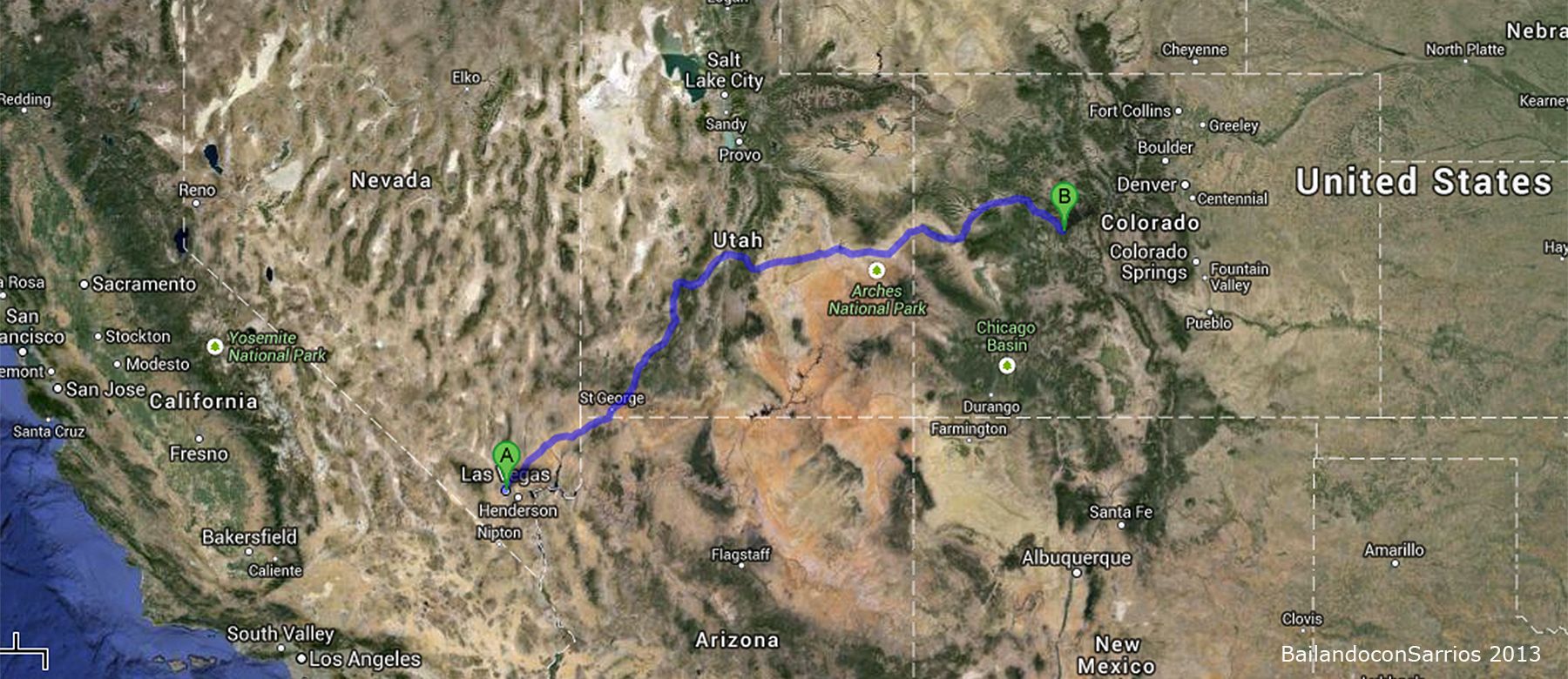 La elección está hecha, volaremos a Las Vegas, capital del Estado de Nevada, y allí alquilaremos un coche para desplazarnos durante un día y medio hasta el Estado de Colorado, pasando por el desértico Estado de Utah y de refilón por el Estado de Arizona, un largo viaje de unas 650 millas, unos 1.050 kilómetros de ida y de vuelta por el Far West!
