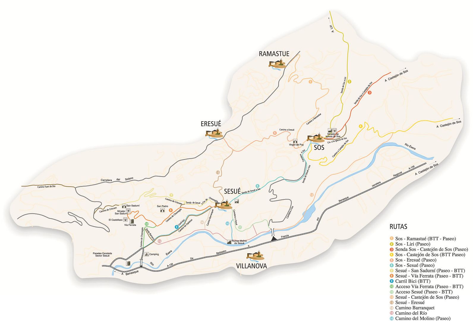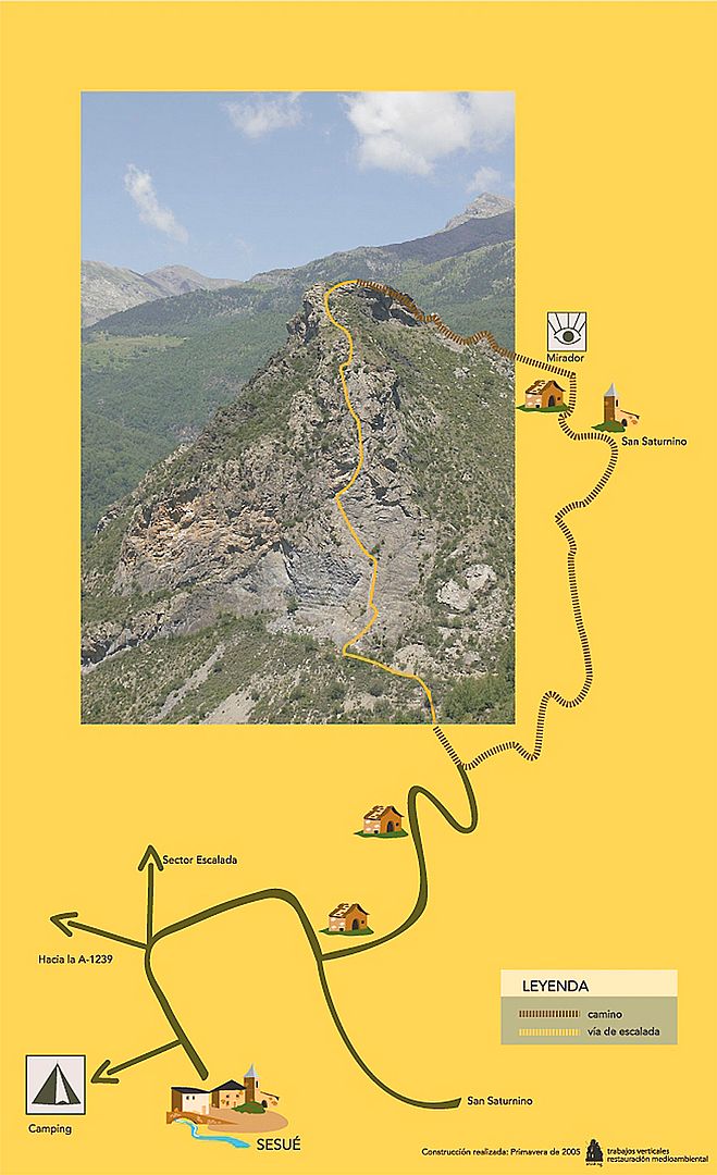 Desde Eriste, continuar por la carretera A-139 en dirección a la salida del Valle de Benasque. A la altura de la entrada Norte del pueblo de Sesué, tomar este desvío a mano izquierda, siguiendo la señalización de la vía ferrata y dejando el Camping La Borda d'Arnalet a mano derecha. Tomar el primer desvío a mano derecha, siguiendo las indicaciones de "vía ferrata" y poco antes de alcanzar el pueblo, tomar a mano izquierda una pista forestal muy evidente donde la vía ferrata también está señalizada. En la primera curva de herradura de la pista, existe un pequeño sobreancho, donde podemos dejar el coche.
