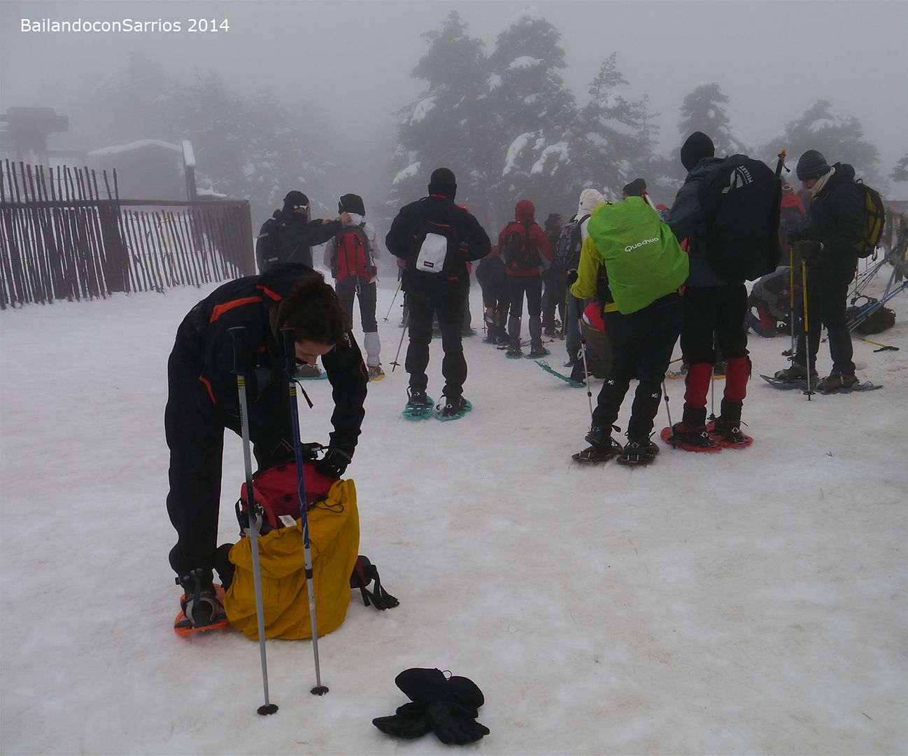 Llegamos al Puerto de Navacerrada y descendemos unos metros en dirección a Segovia para aparcar en un parking lateral, vamos con retraso debido al atasco por lo que nos entretenemos lo justo en bajar del autobús y en ponernos en marcha en dirección a lo alto del puerto, donde nos espera Susana con su furgoneta para equiparnos con las raquetas.