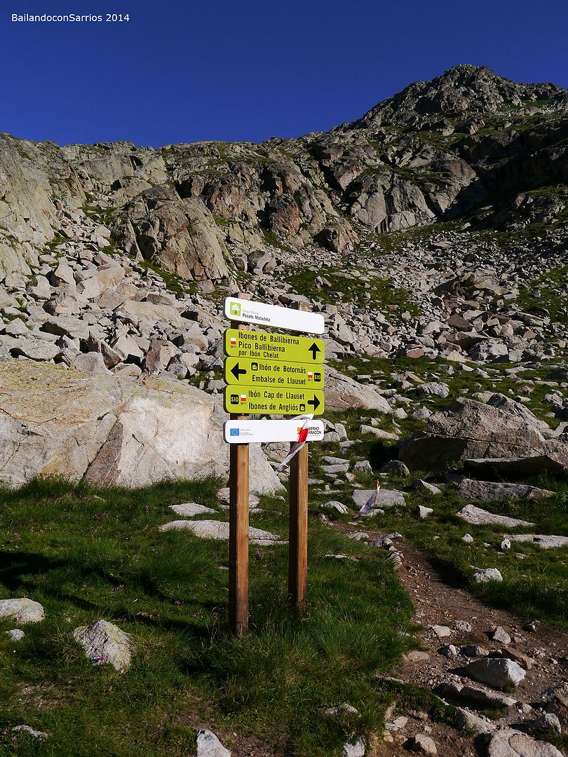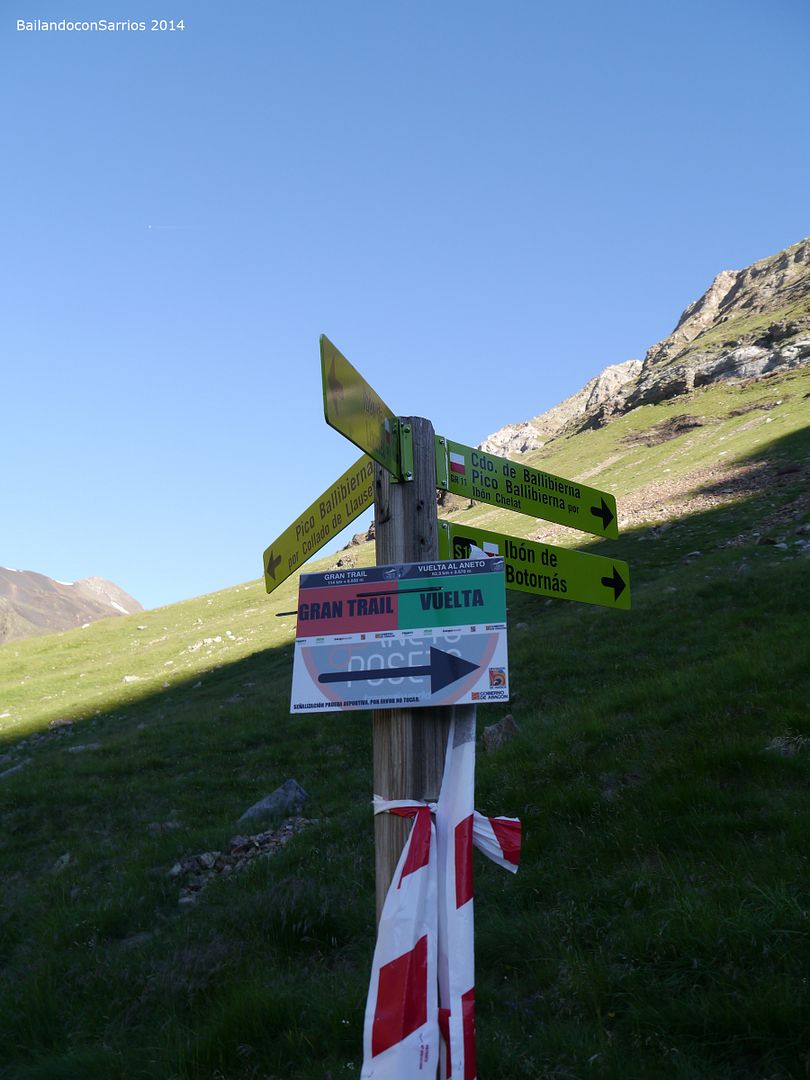 Llegamos al desvío hacia el Collado de Ballibierna, donde encontramos la señalización del GRAN TRAIL ANETO-POSETS del próximo fin de semana, y es que, desde que hemos salido, el GR 11 está plagado de marcas para los corredores de este trail.