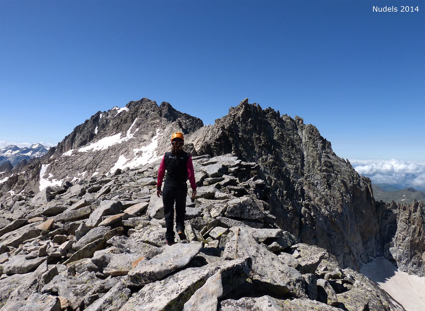 La cresta no parece excesivamente complicada pero Nudels retrocede hasta mi posición para enlazar la Antecima Sureste con la cima principal por un terreno menos expuesto.