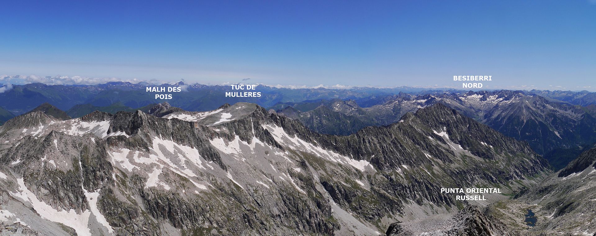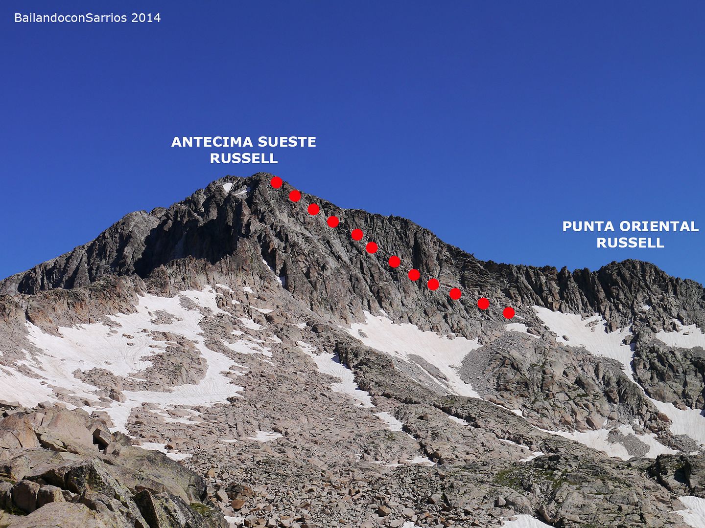 El majestuoso Russell nunca deja indiferente: él y sus cinco Tresmiles satélites constituyen los últimos Tresmiles por la vertiente SE del Macizo de la Maladeta y sus vías normales, aunque sencillas en cuanto a dificultad, son largas y discurren por un caótico terreno de bloques, por lo que tachar las 6 cimas en una sola jornada no es tarea fácil.