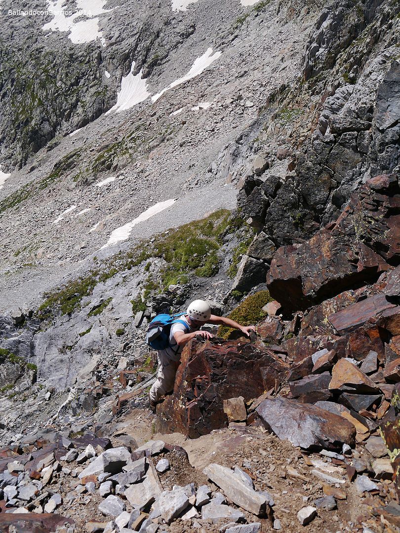 Pasos de grado II en la vía Normal al Malh des Pois o Forcanada, la descompuesta canal o chimenea Sur de acceso a la Cima Sur de la Forcanada, donde es necesario extremar la precaución debido a la caída de rocas y a la inestabilidad del terreno.