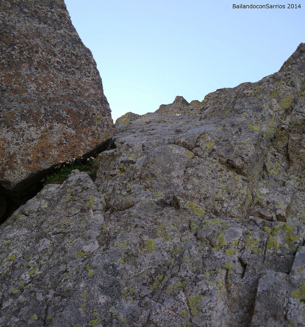 Paso de grado II durante los metros finales en la Canal Noroeste o Canal Nord-Oest, una trepada con buenos agarres junto a un bloque empotrado para acceder a la brecha en la que desemboca la canal.