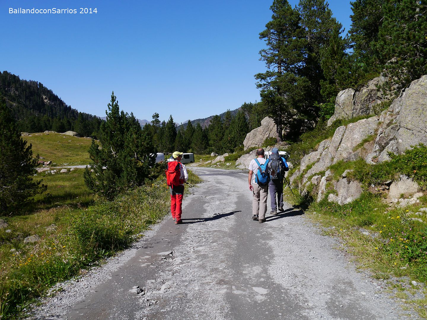 Recorriendo la pista, ya muy cerca del aparcamiento de Banhs de Tredós, reconocemos desde el coche a Joana y a Josemi, que bajan andando hasta el aparcamiento después de hacer un recorrido por los Estanhs de Colomèrs.