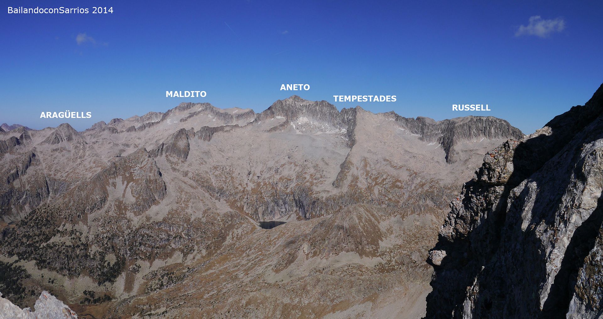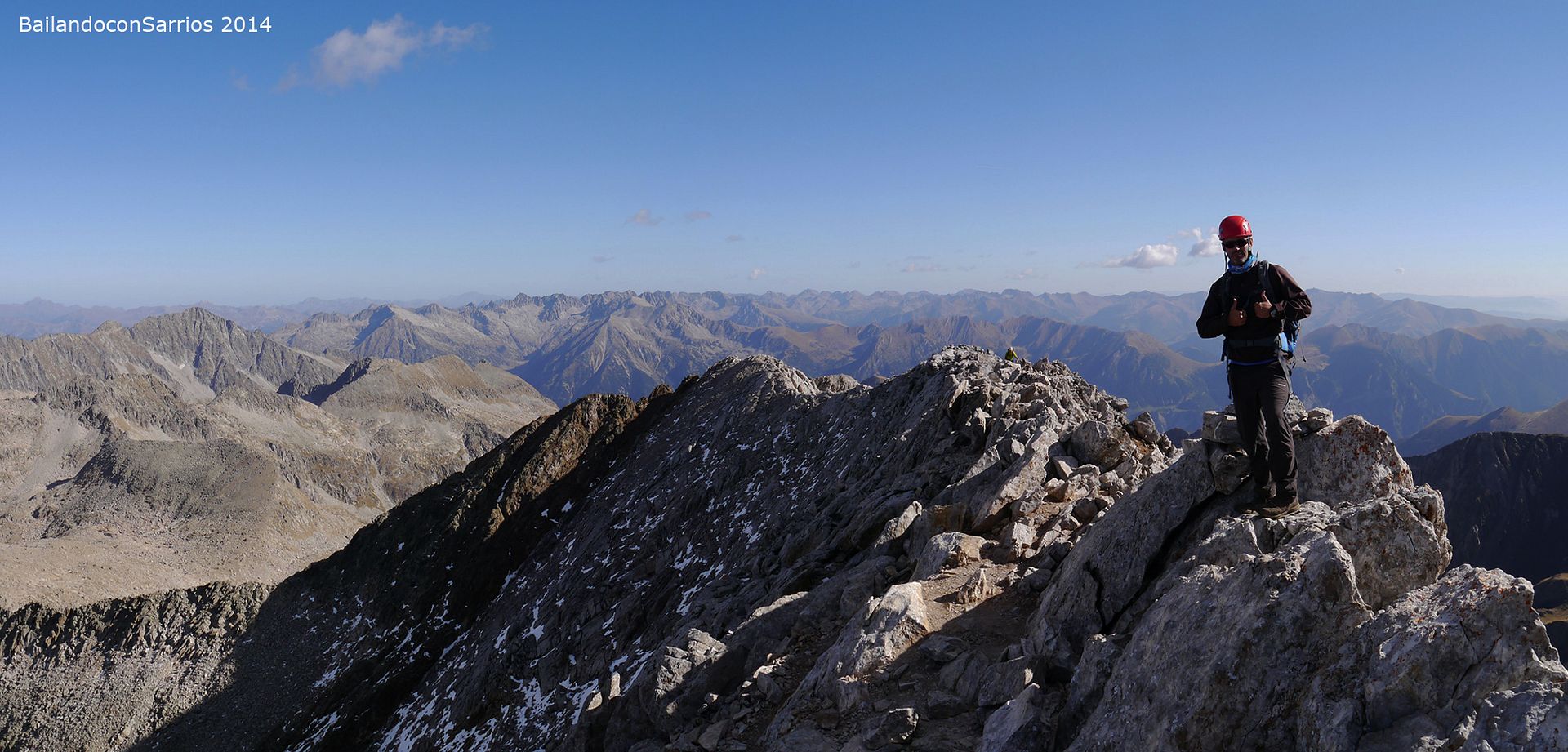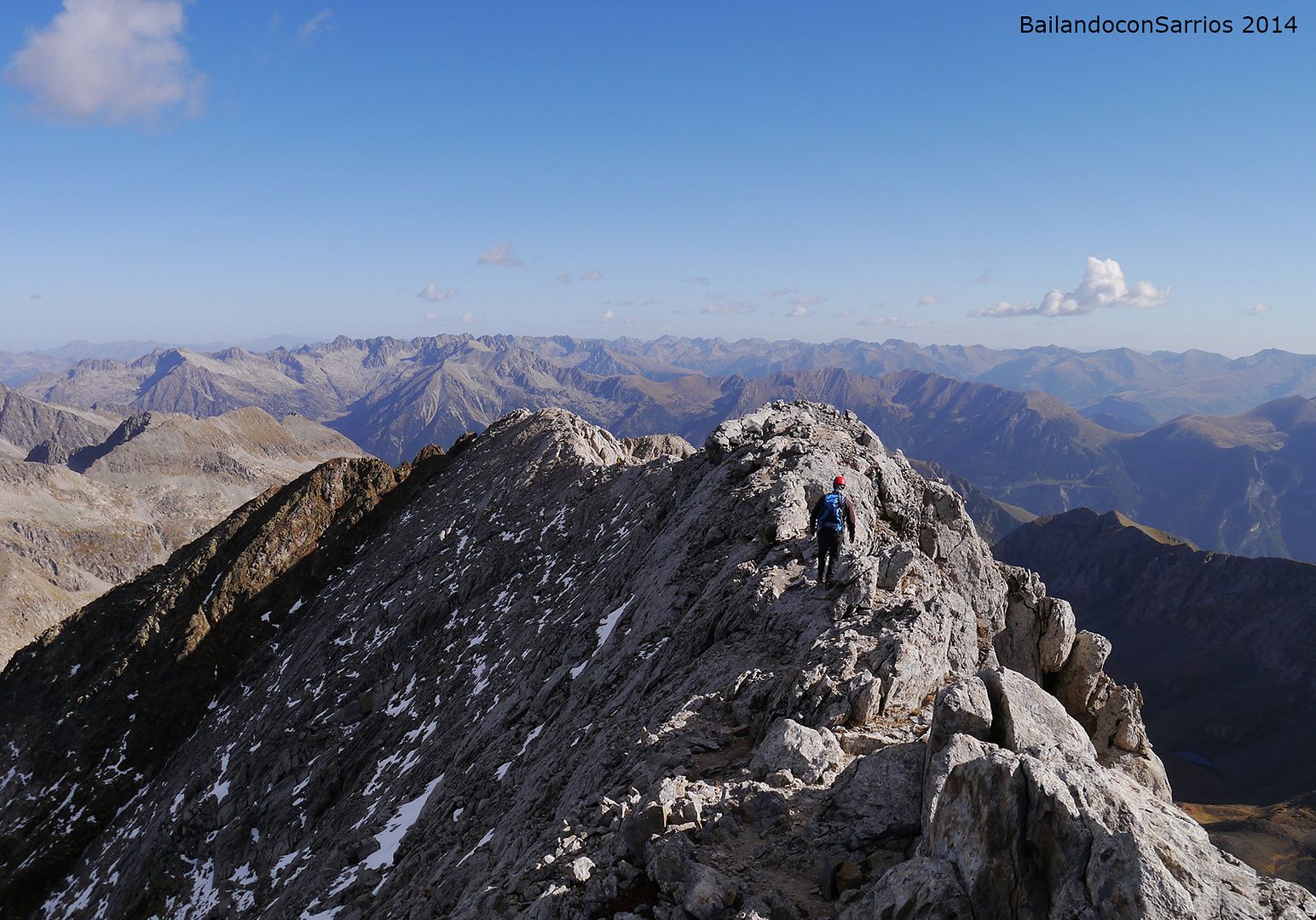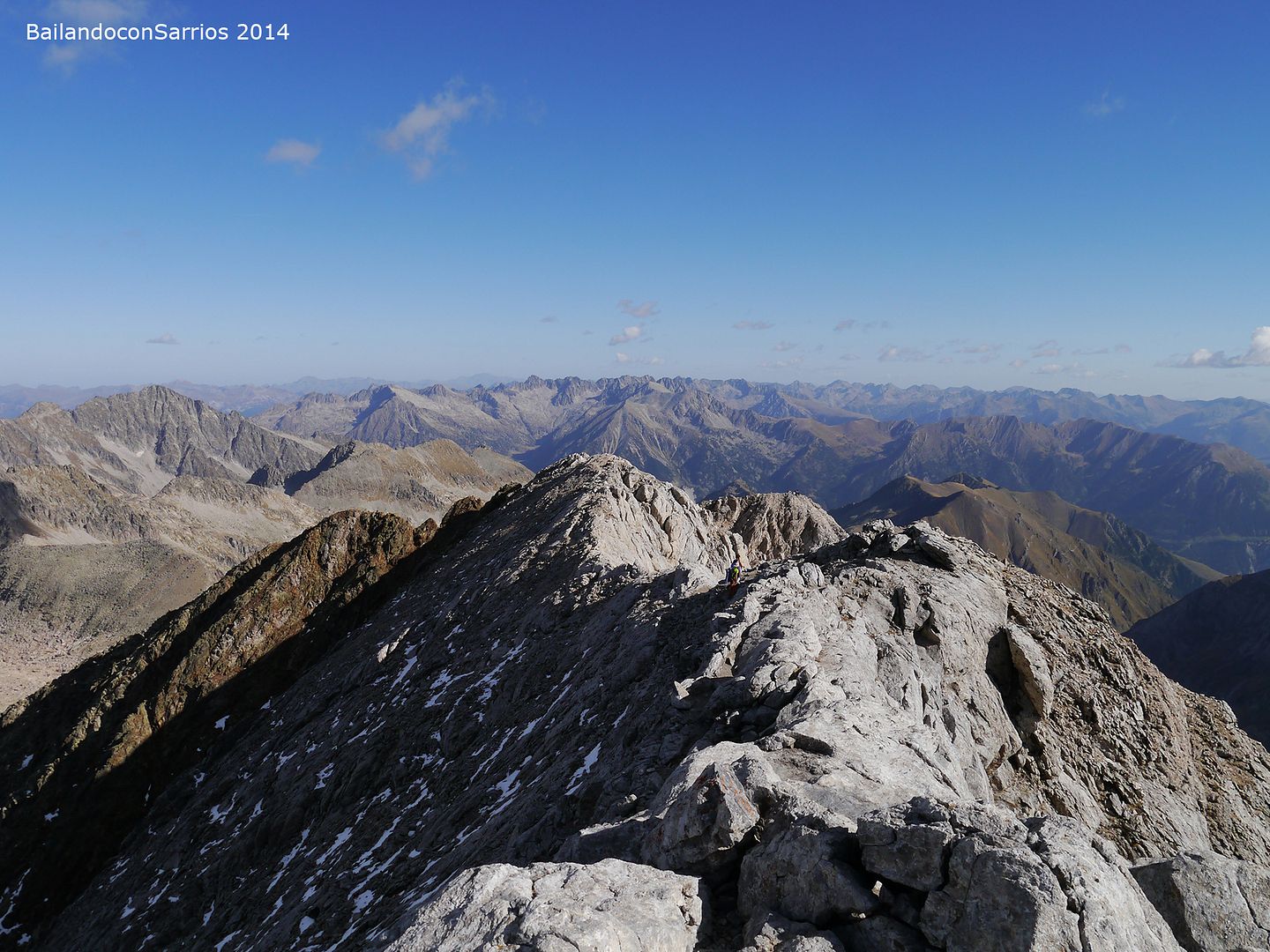 Aprovechando la visita de Mane a la Val d'Aran, no dejamos escapar la oportunidad para ascender a los mejores miradores de la vertiente meridional del Macizo de la Maladeta y para recorrer el famoso "Paso del Caballo", la afilada arista de caliza que une las dos cumbres.