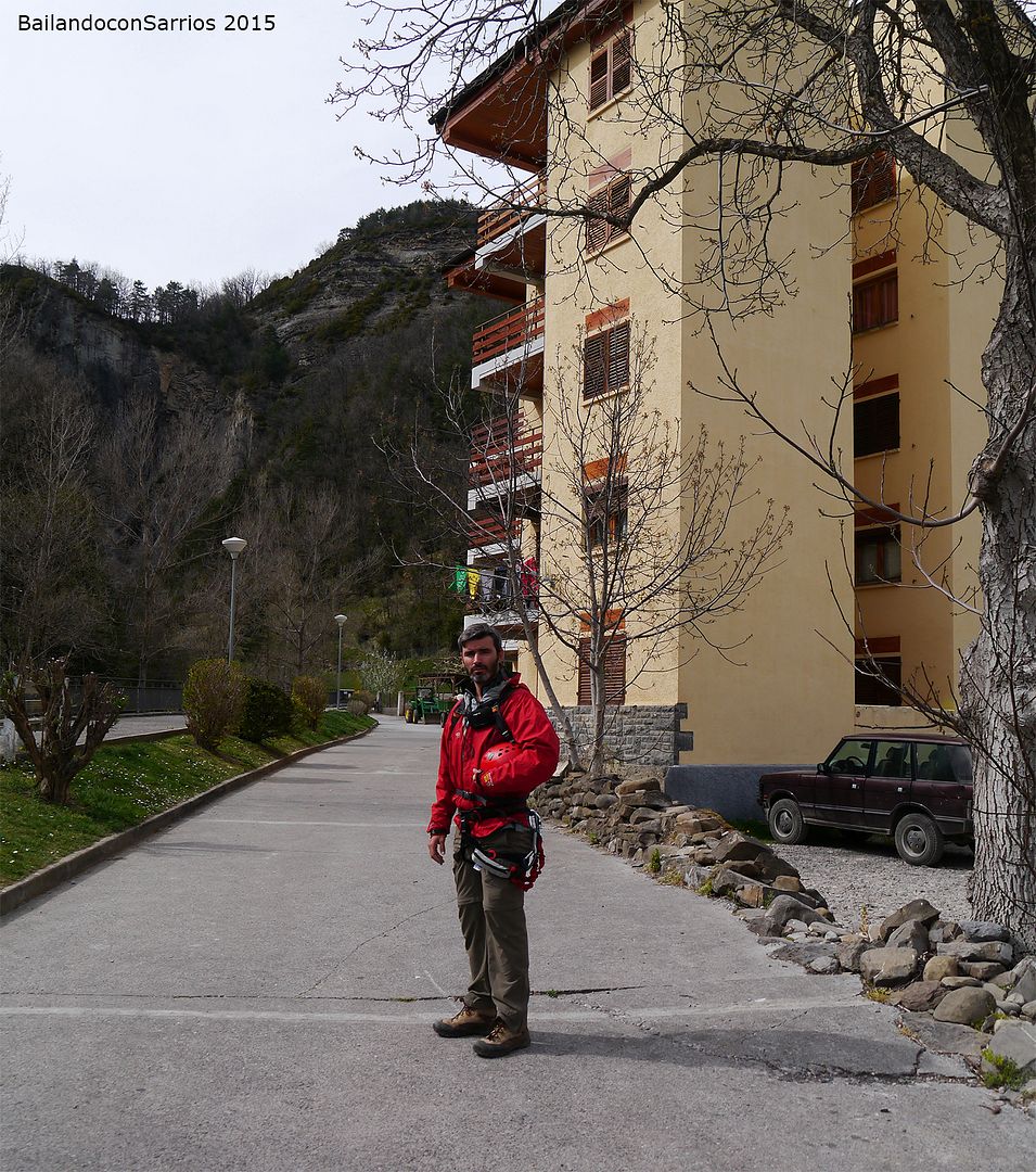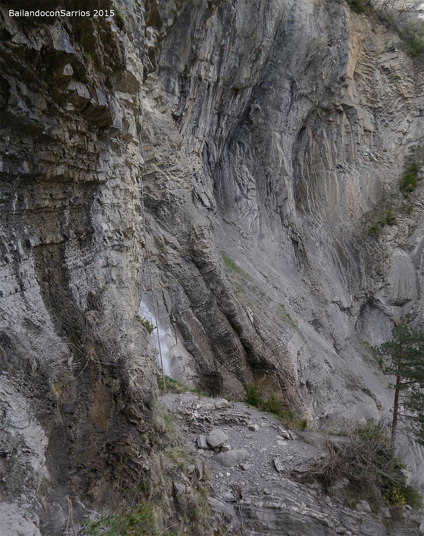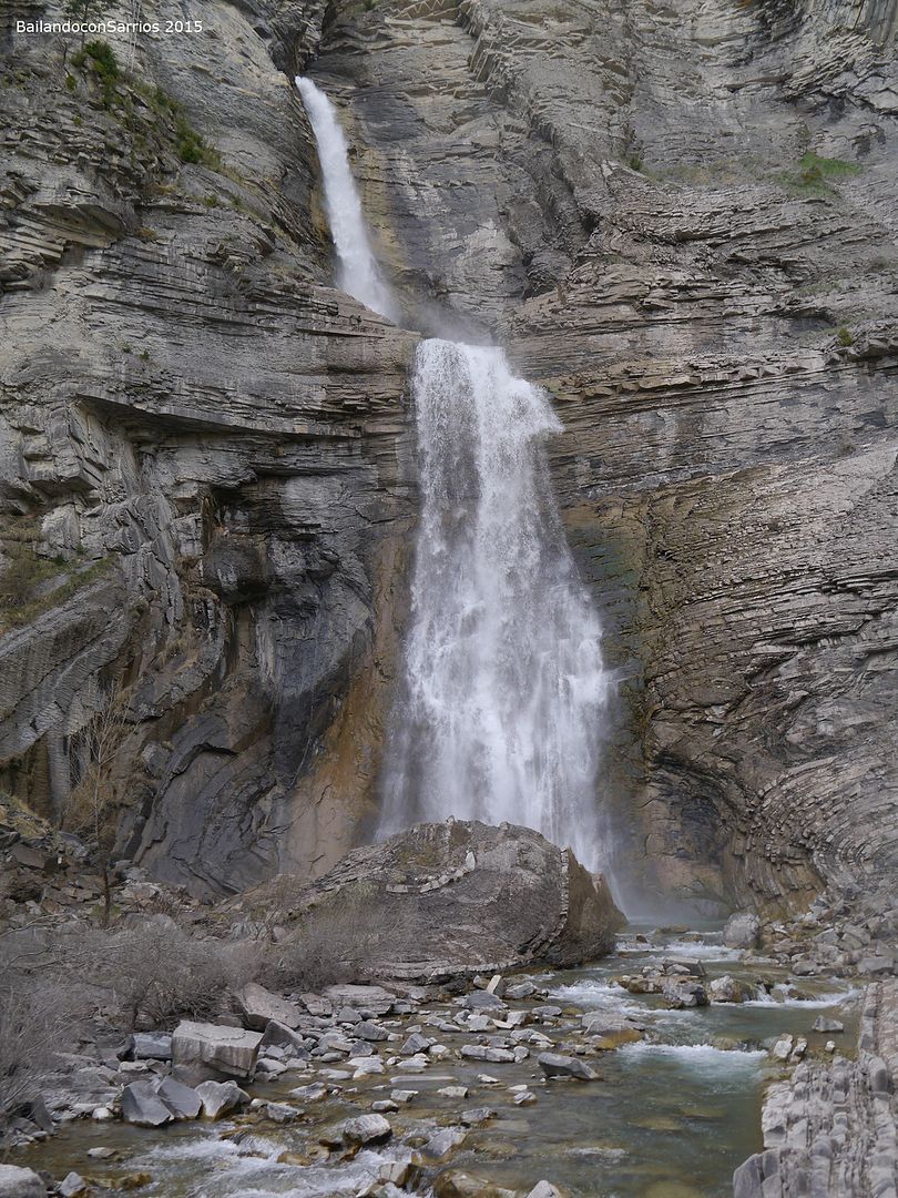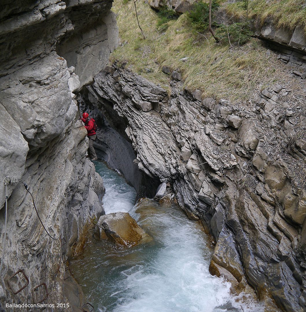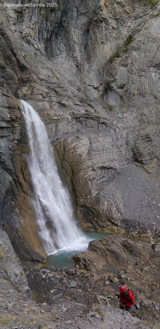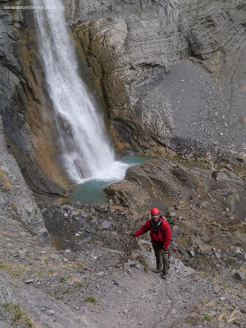 Aparcamos el coche y tras equiparnos, a las 16:30 PM nos ponemos en marcha amenizados por el sonido de la Cascada del Sorrosal... la ferrata está abierta desde Semana Santa, como así nos informaron ayer en la oficina de información de Broto, pero el caudal de la cascada es impresionante, como ya hemos visto al llegar al pueblo.