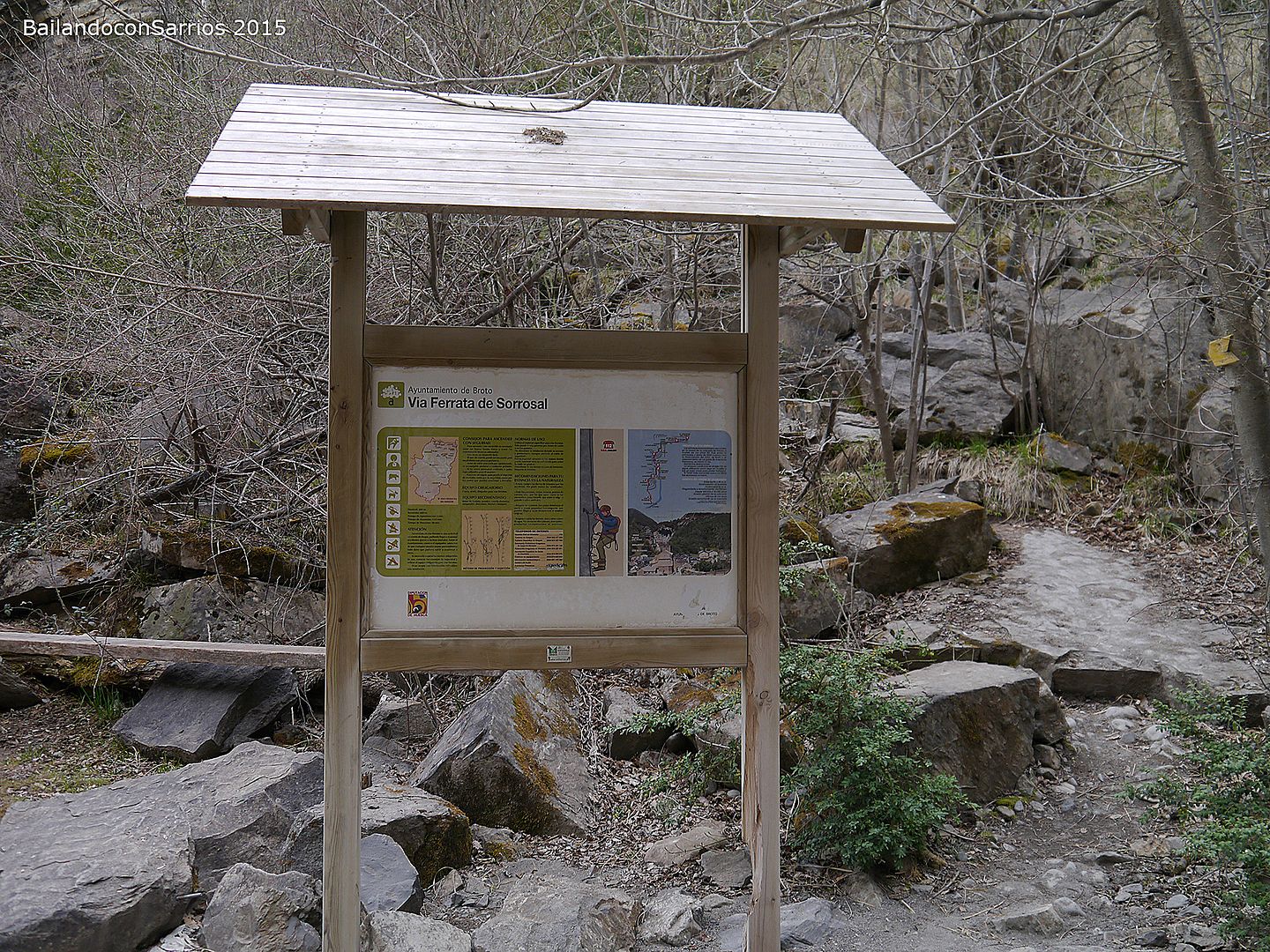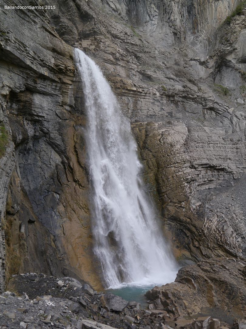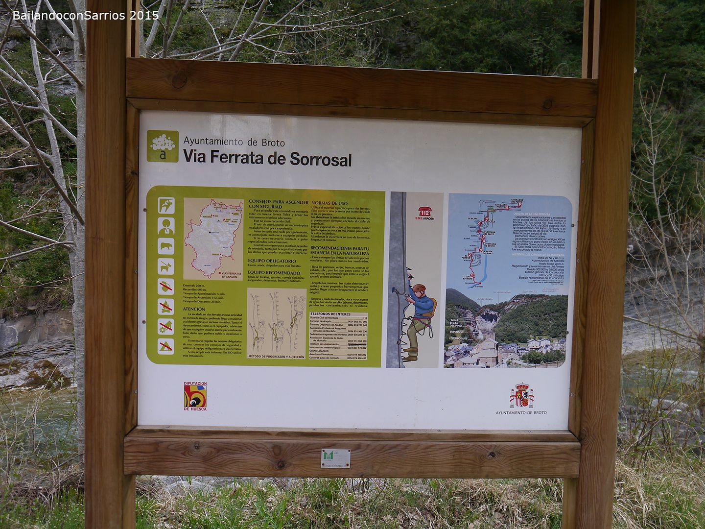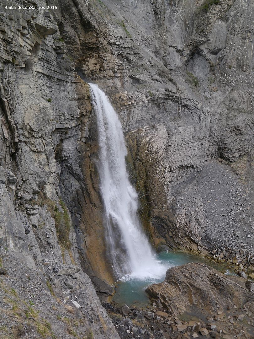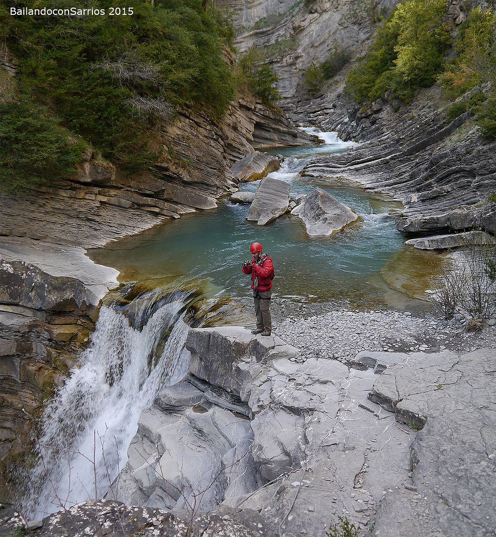 Aparcamos el coche y tras equiparnos, a las 16:30 PM nos ponemos en marcha amenizados por el sonido de la Cascada del Sorrosal... la ferrata está abierta desde Semana Santa, como así nos informaron ayer en la oficina de información de Broto, pero el caudal de la cascada es impresionante, como ya hemos visto al llegar al pueblo.