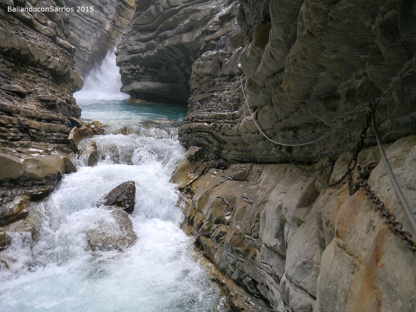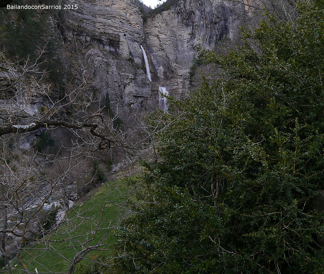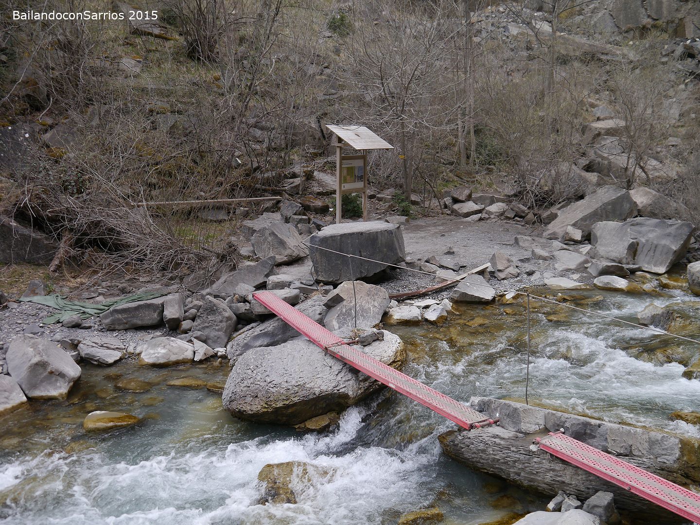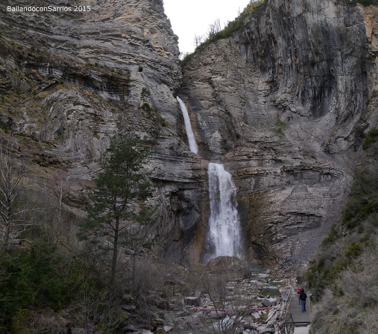 Aparcamos el coche y tras equiparnos, a las 16:30 PM nos ponemos en marcha amenizados por el sonido de la Cascada del Sorrosal... la ferrata está abierta desde Semana Santa, como así nos informaron ayer en la oficina de información de Broto, pero el caudal de la cascada es impresionante, como ya hemos visto al llegar al pueblo.