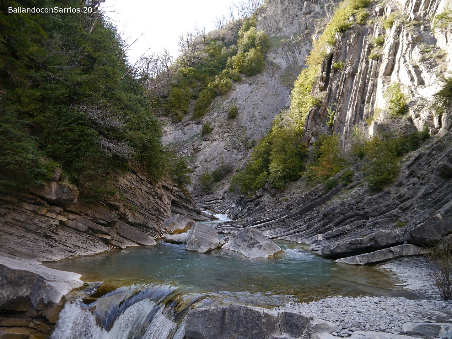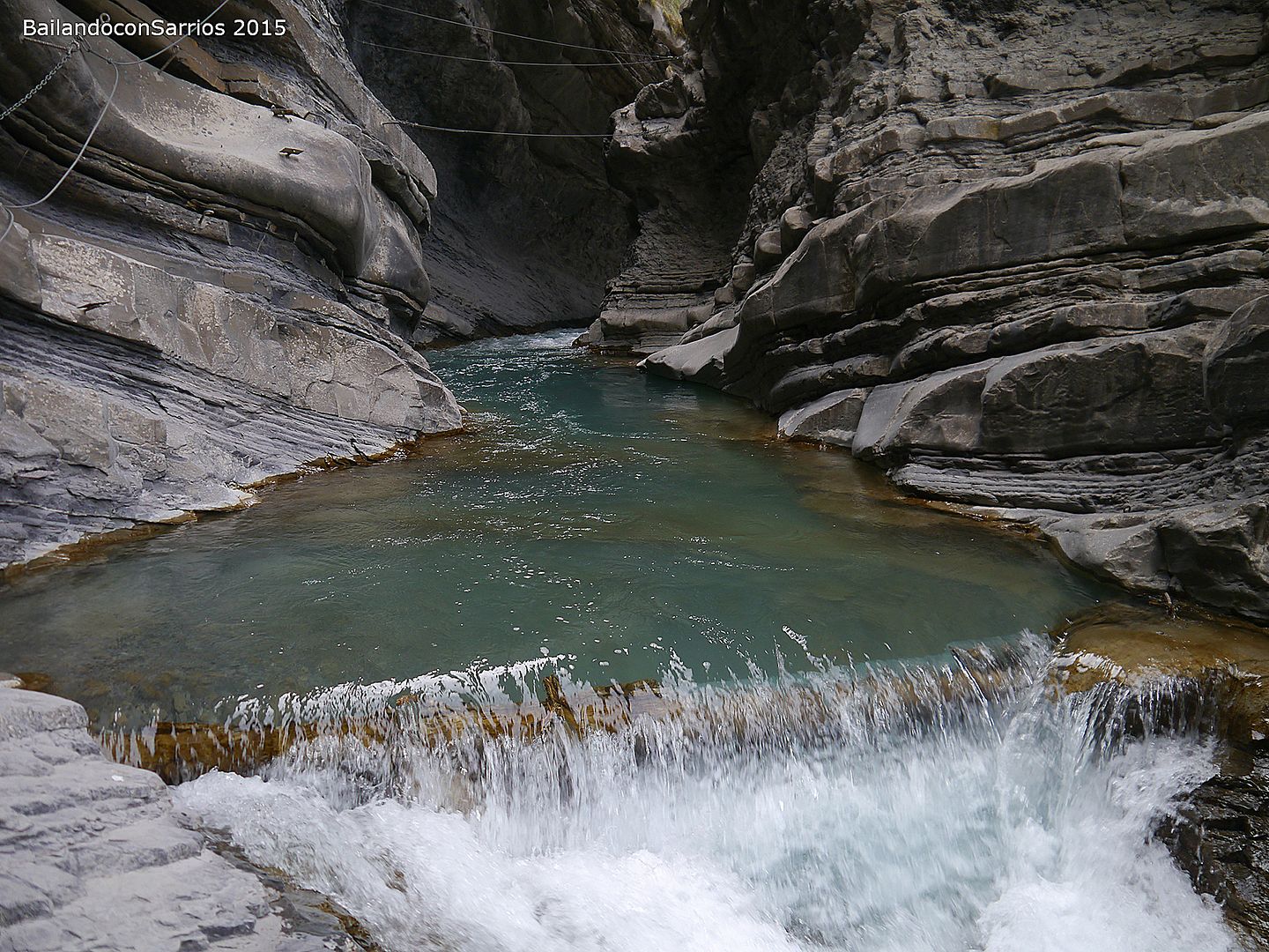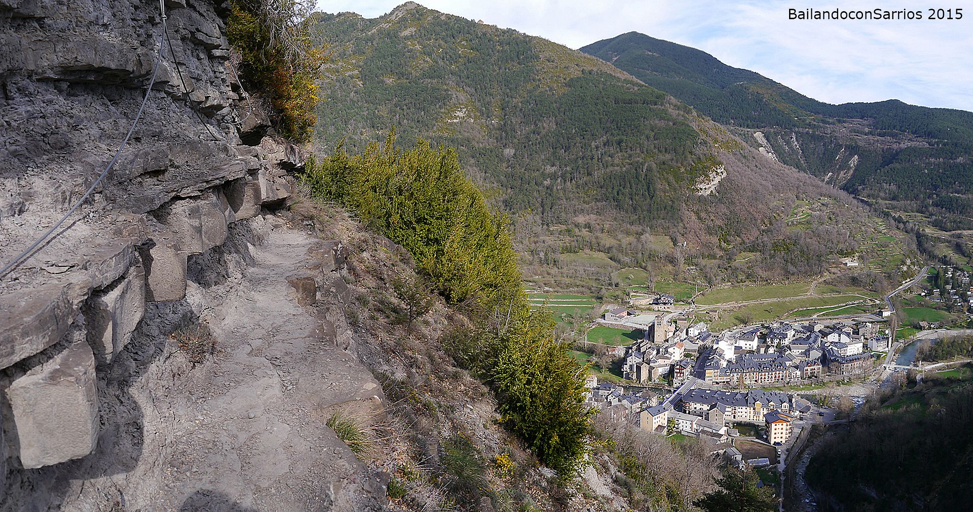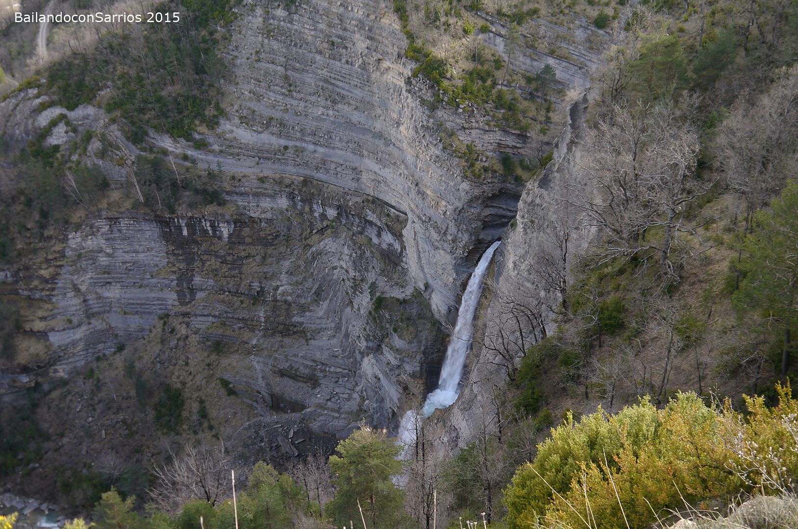Aparcamos el coche y tras equiparnos, a las 16:30 PM nos ponemos en marcha amenizados por el sonido de la Cascada del Sorrosal... la ferrata está abierta desde Semana Santa, como así nos informaron ayer en la oficina de información de Broto, pero el caudal de la cascada es impresionante, como ya hemos visto al llegar al pueblo.