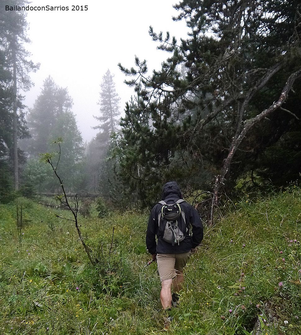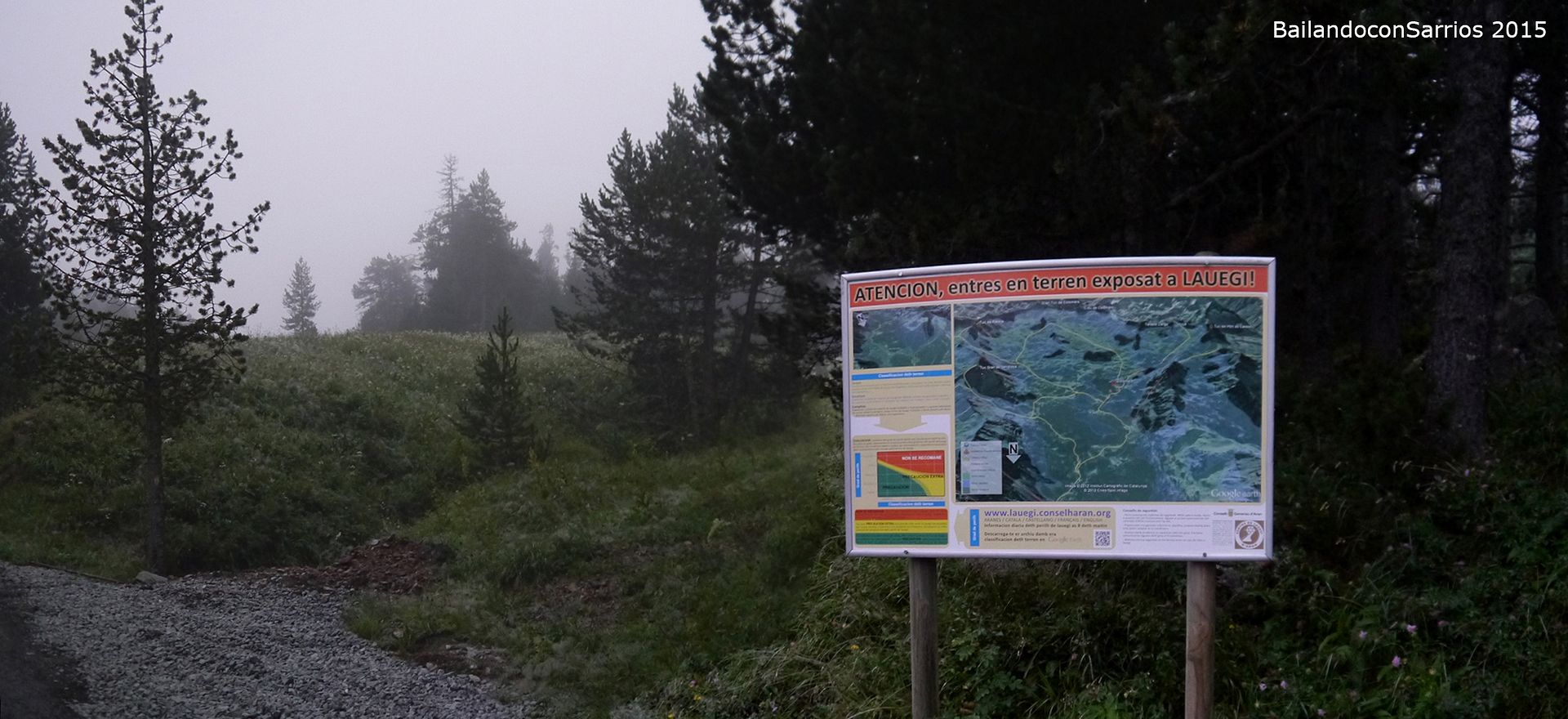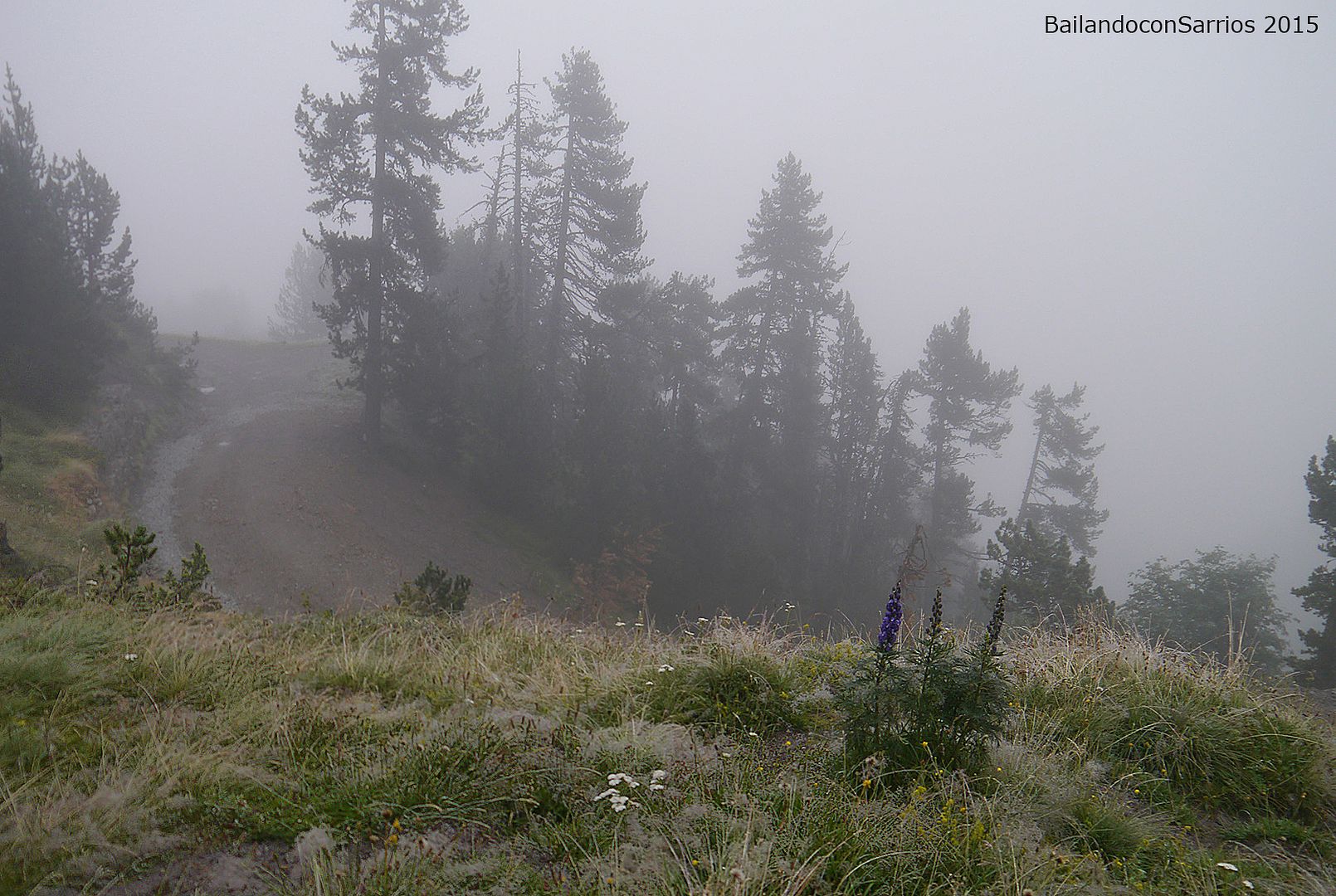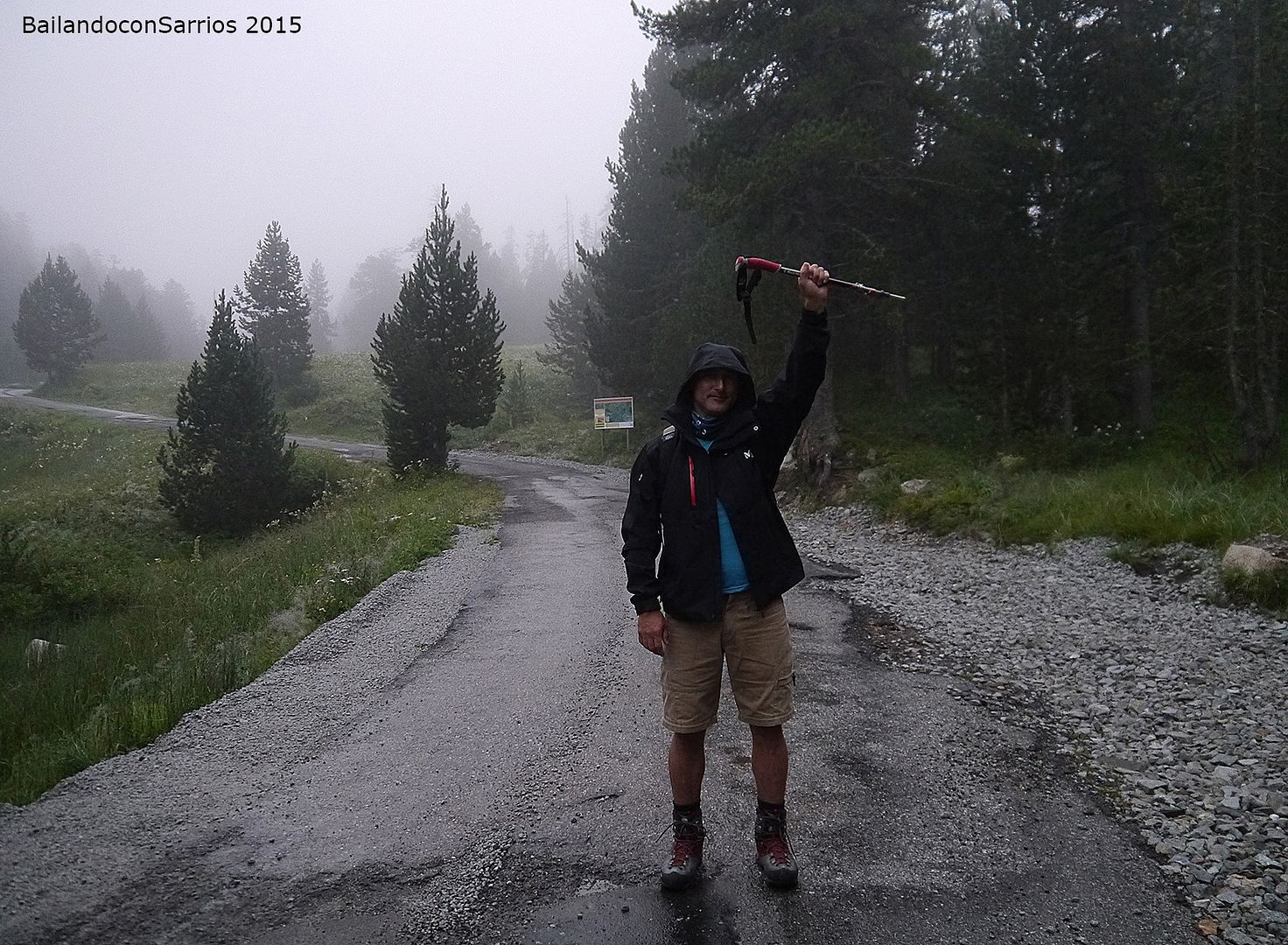 La pendiente se acentúa y la leve lluvia no da tregua, yo avanzo con cuidado, un paso mal dado y se irán al traste mis semanas previas de recuperación... casi sin darnos cuenta, nos plantamos en la pista forestal que comunica con el Pònt dera Montanheta y con Banhs de Tredòs, donde hacemos una parada para picar algo antes de continuar.