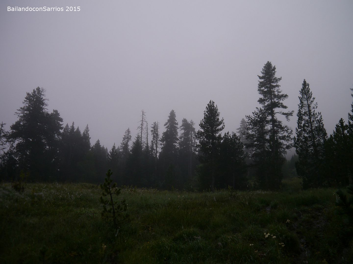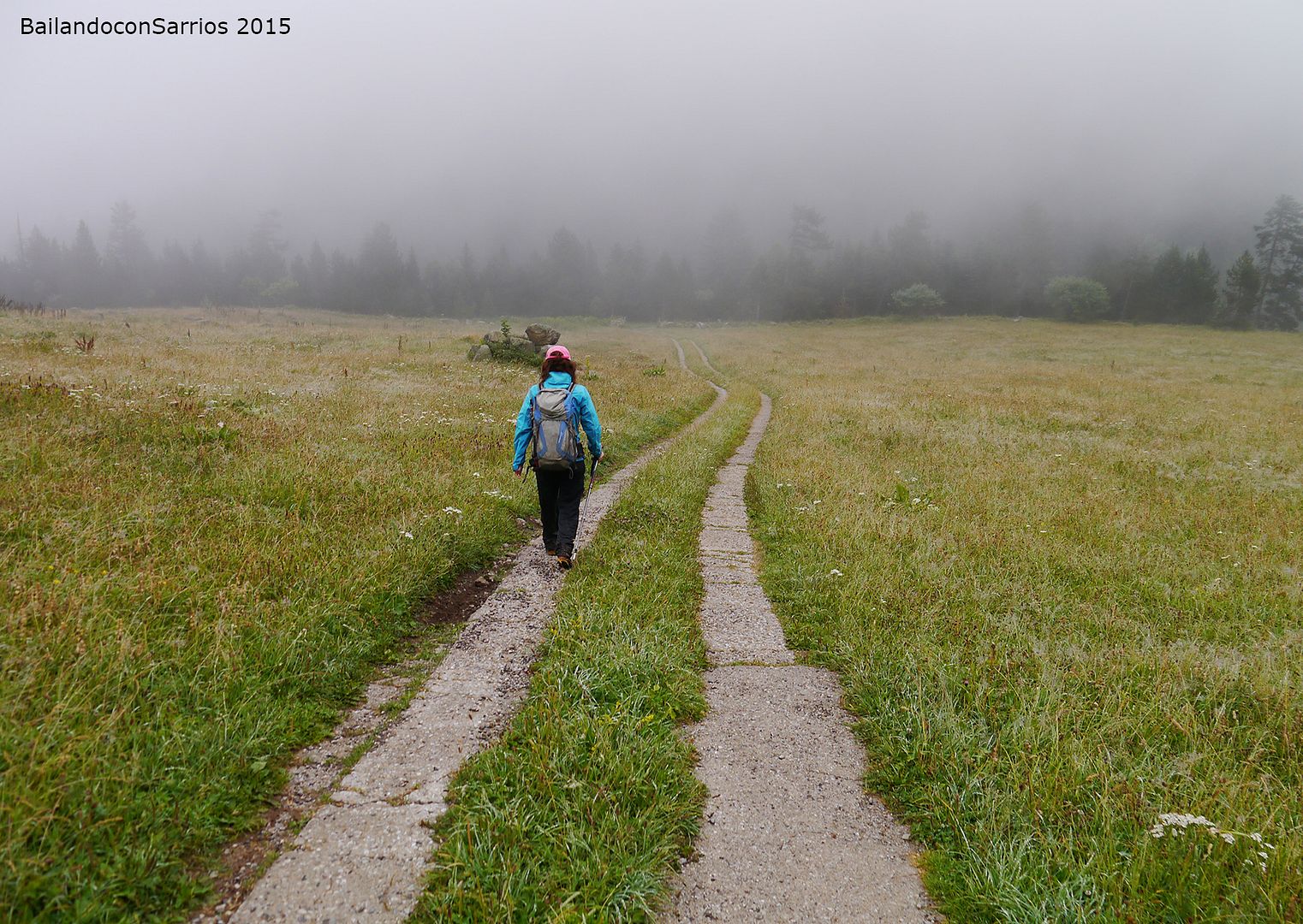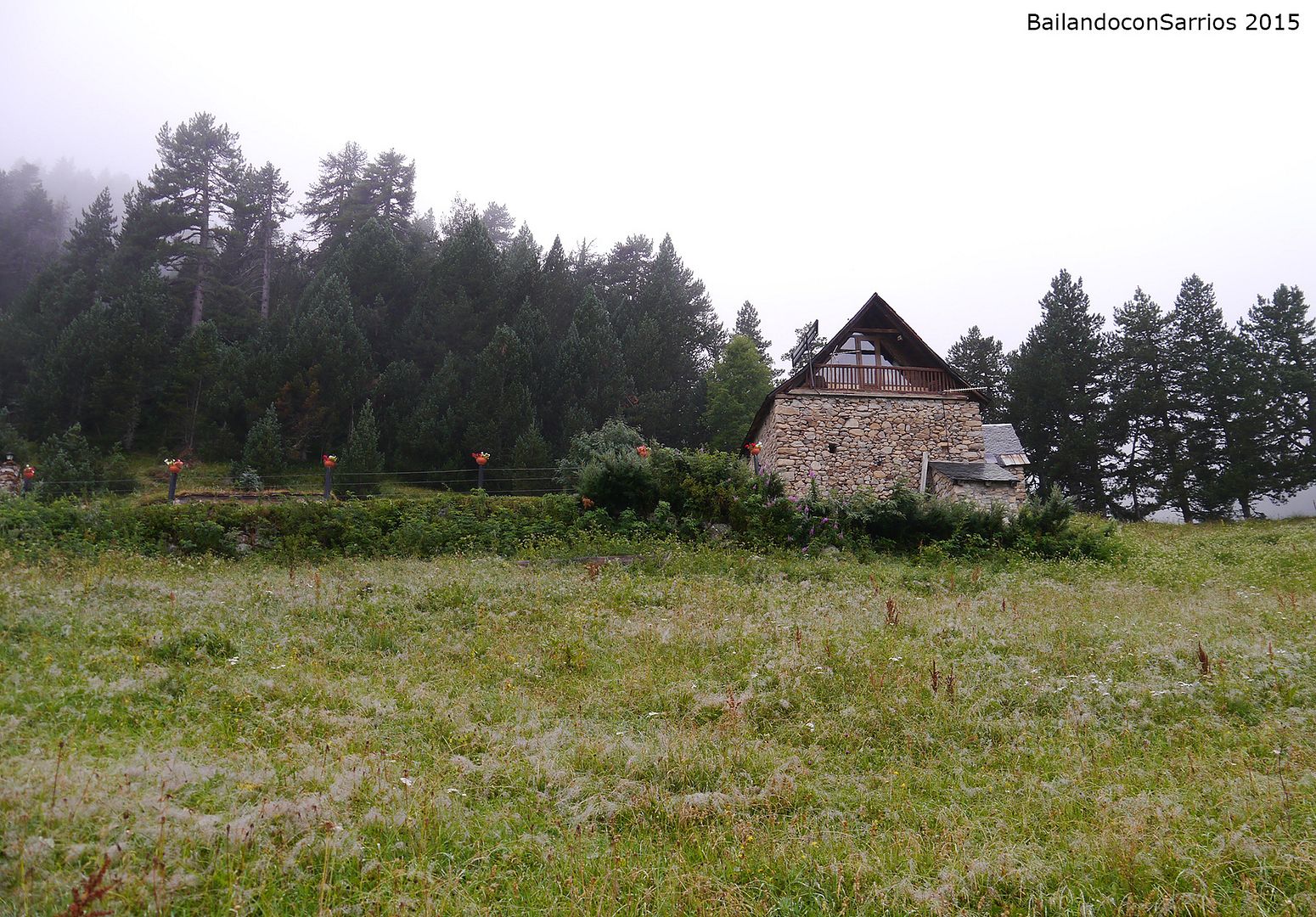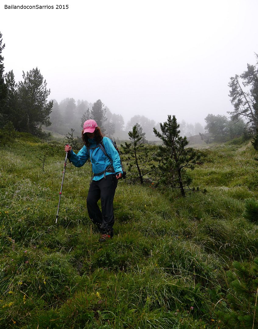 La pendiente se acentúa y la leve lluvia no da tregua, yo avanzo con cuidado, un paso mal dado y se irán al traste mis semanas previas de recuperación... casi sin darnos cuenta, nos plantamos en la pista forestal que comunica con el Pònt dera Montanheta y con Banhs de Tredòs, donde hacemos una parada para picar algo antes de continuar.