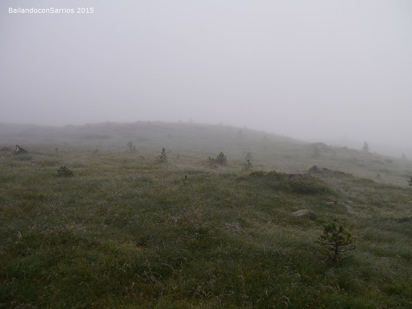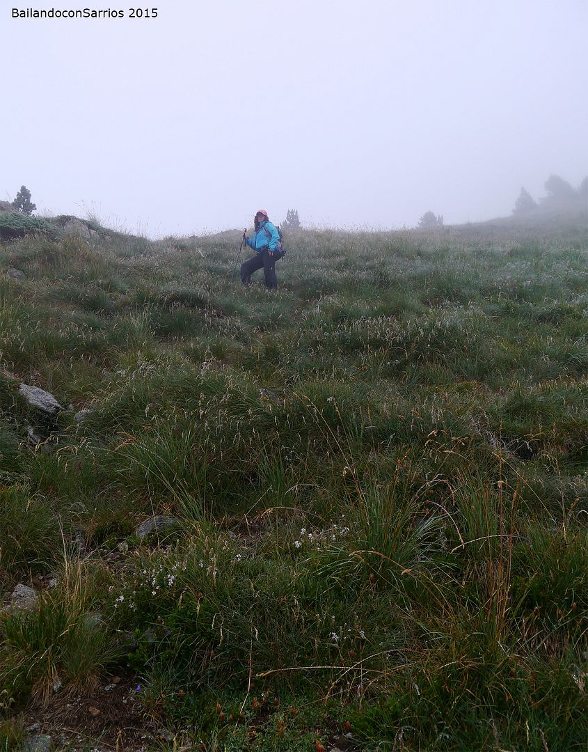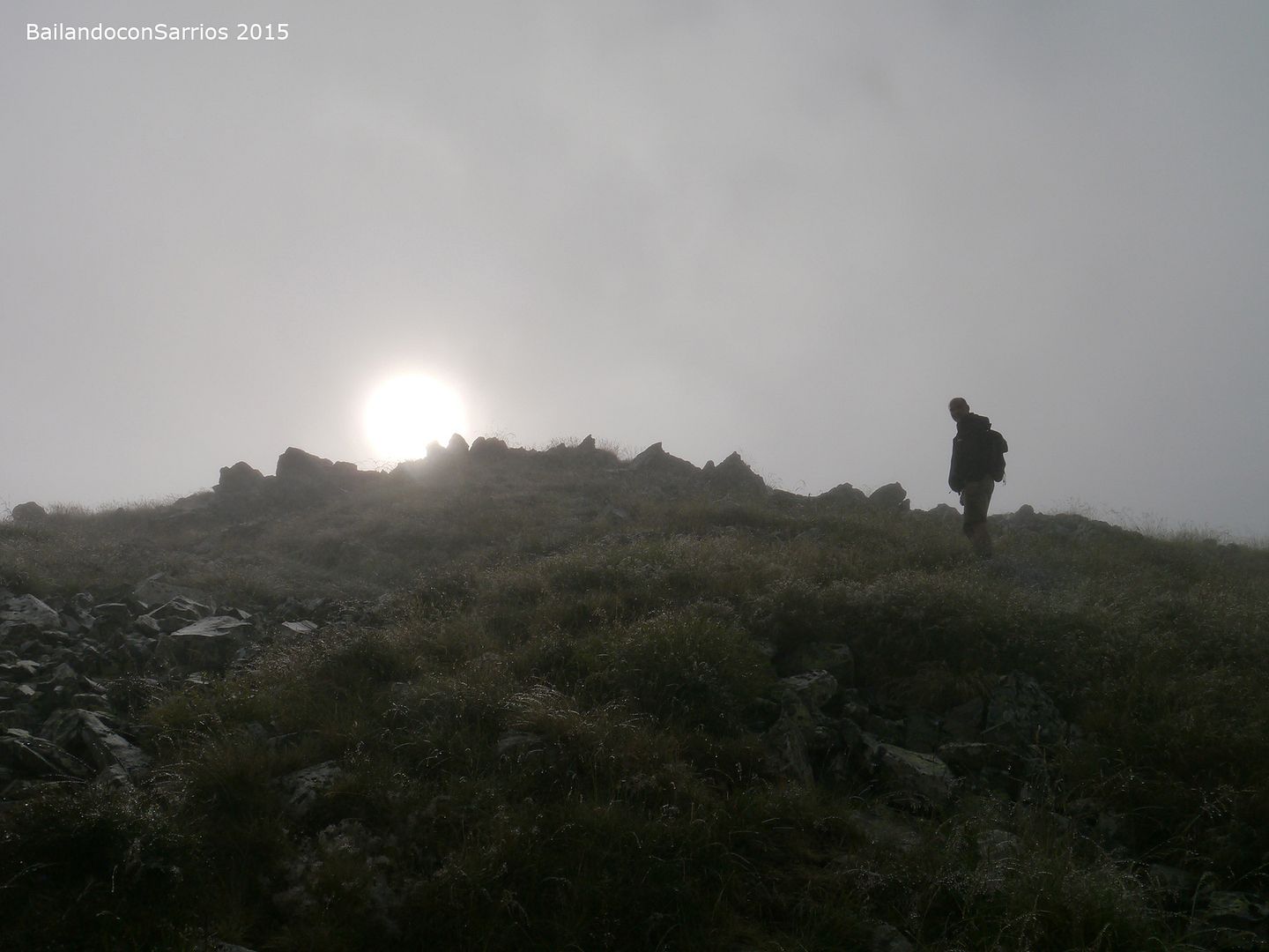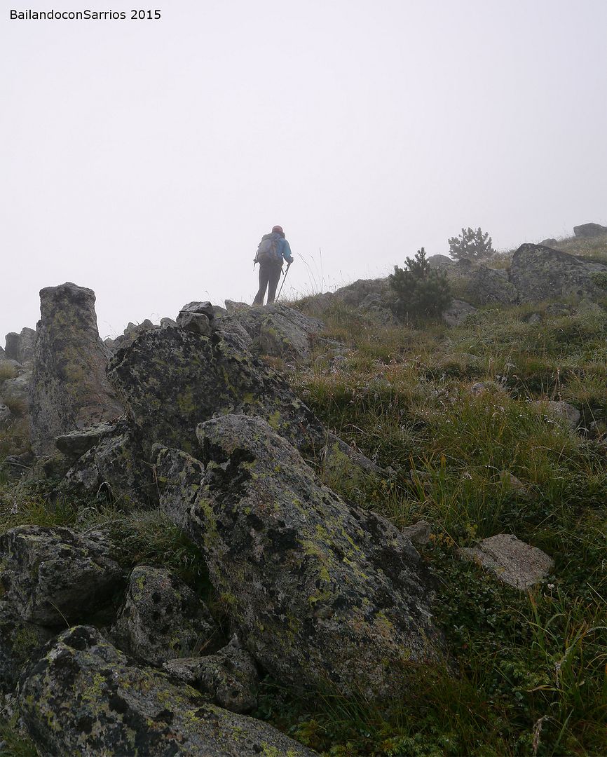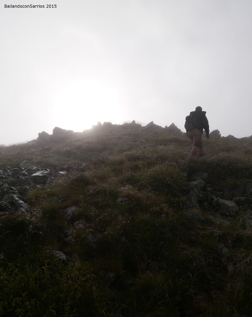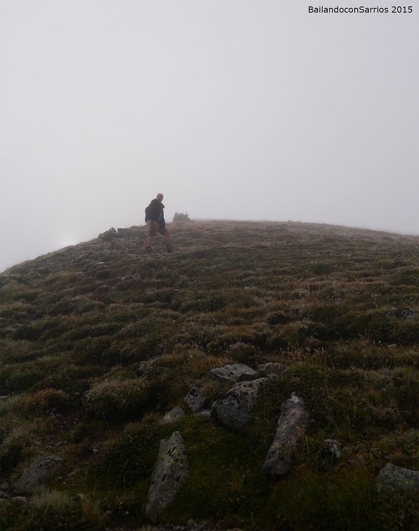 La densa niebla no ayuda mucho, a estas alturas tendríamos que estar viendo la espectacular vertiente Norte de nuestro objetivo de hoy... suerte que el track en el smartphone nos ayuda a orientarnos para intentar enlazar con la cresta NO hasta la cima.