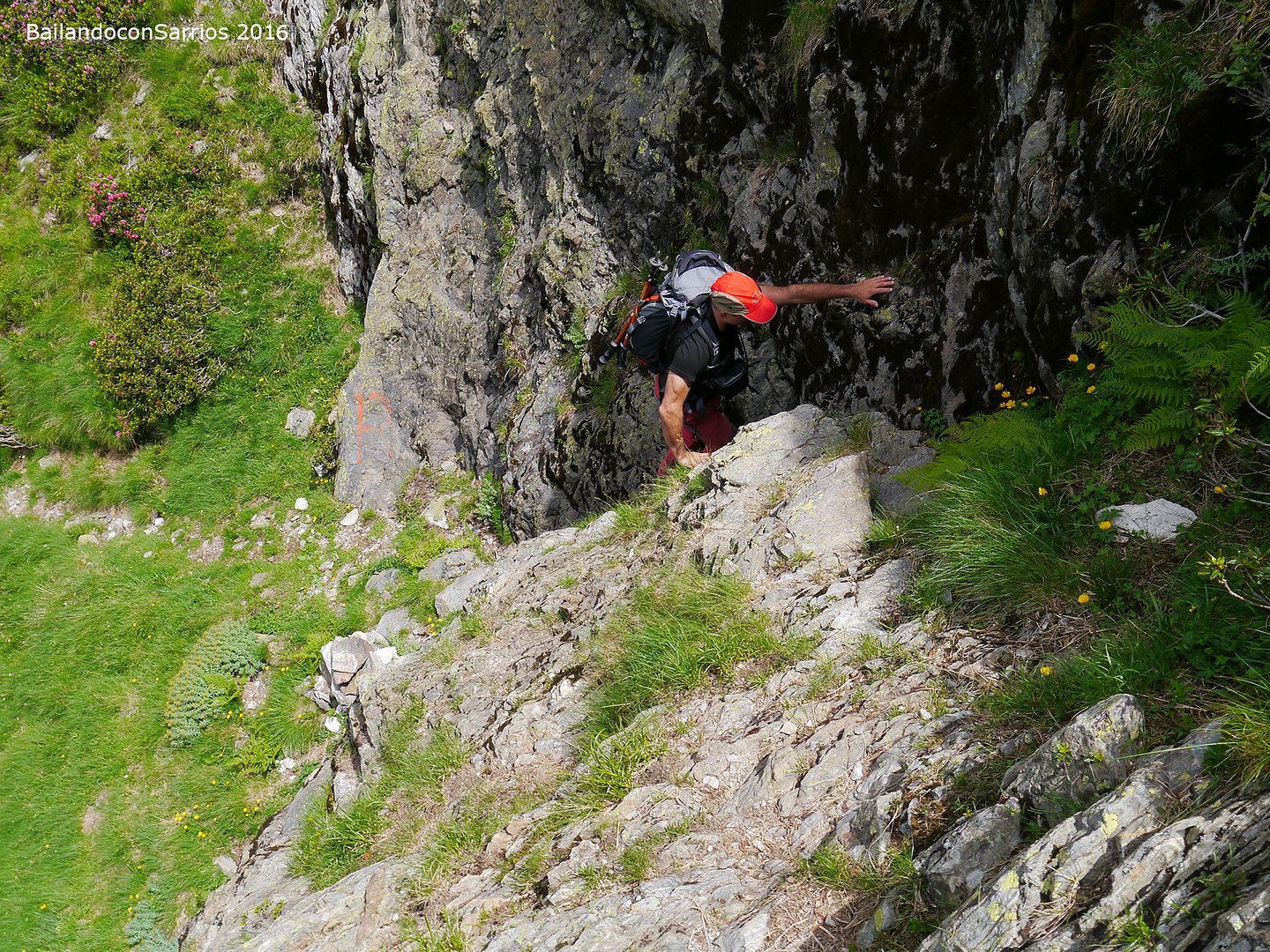 Gracias a nuestra intuición montañera, hemos encontrado el sendero que nos conducirá casi hasta la cima... avanzamos unos metros y por fin visualizamos el primero de los pasos clave de esta ascensión, una trepada sencilla con muchos agarres (grado II), otra historia será si el terreno está mojado.