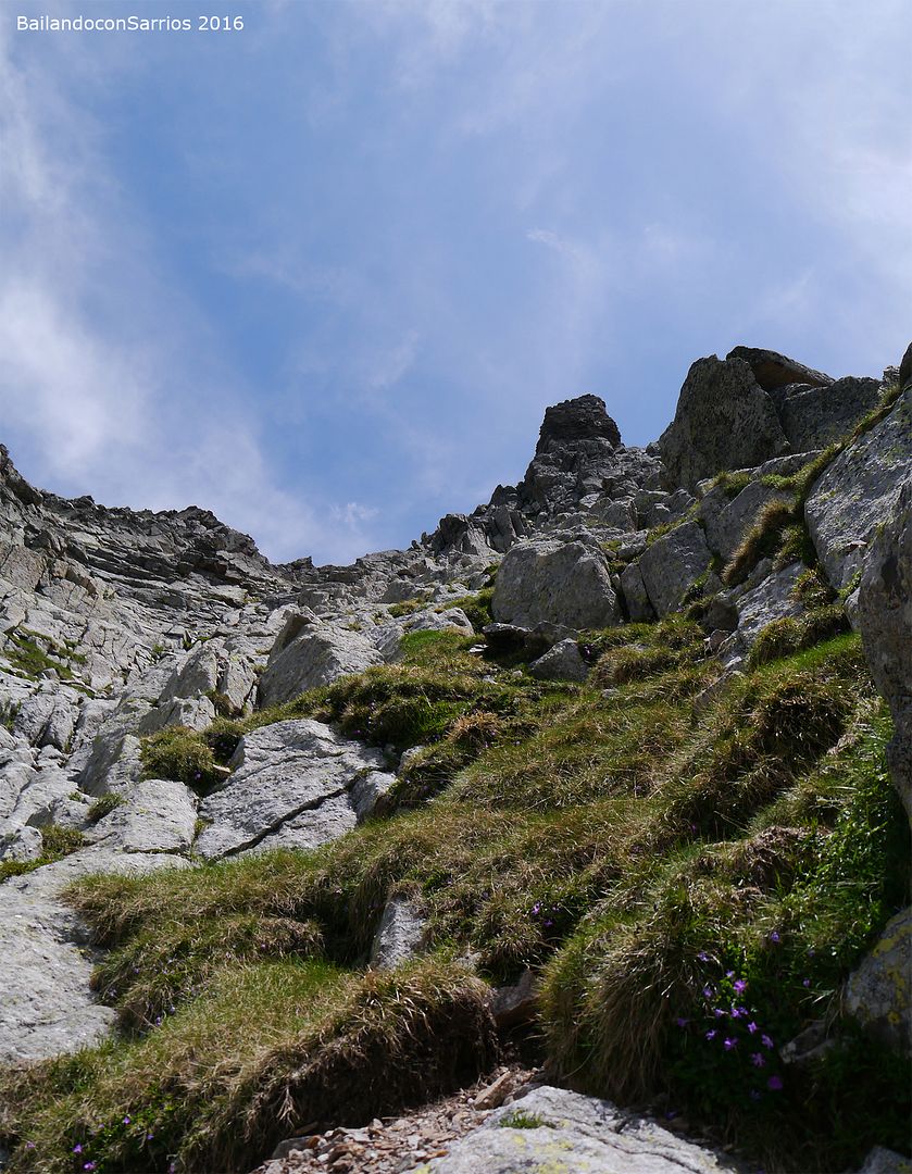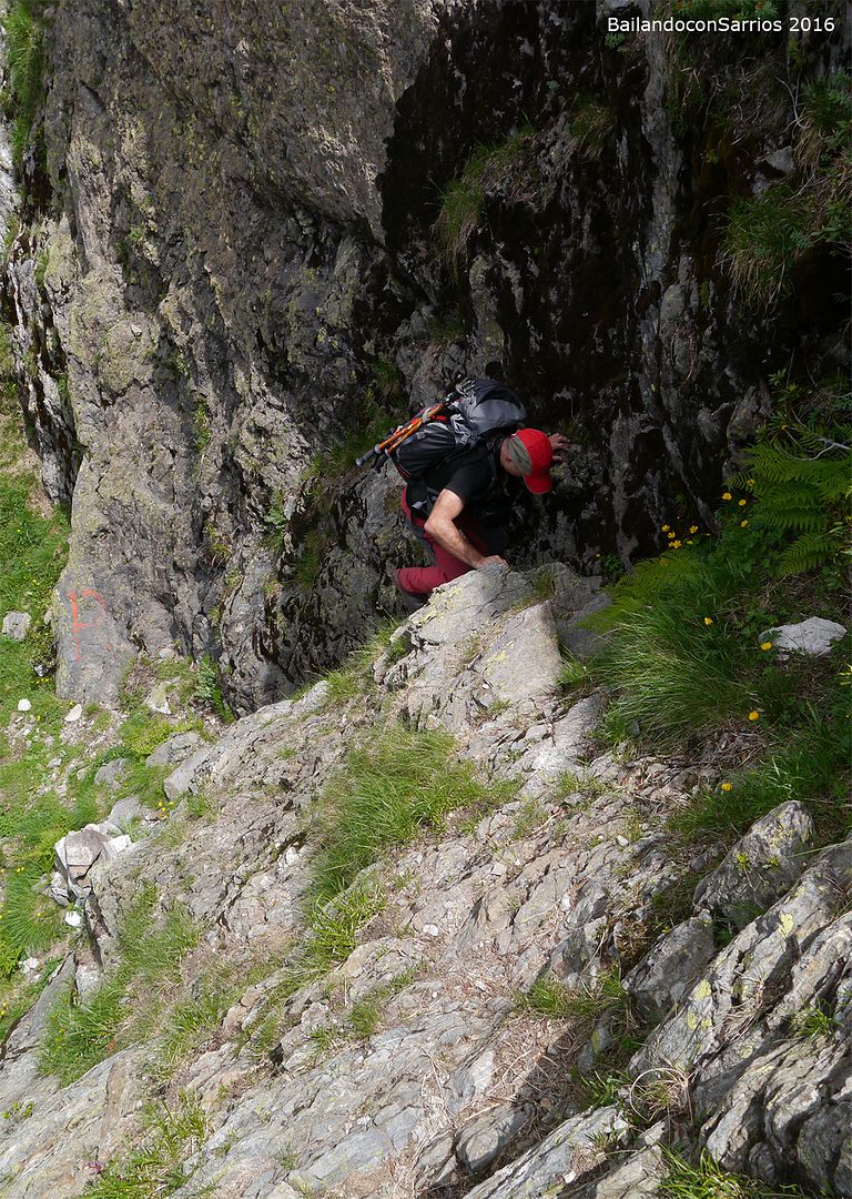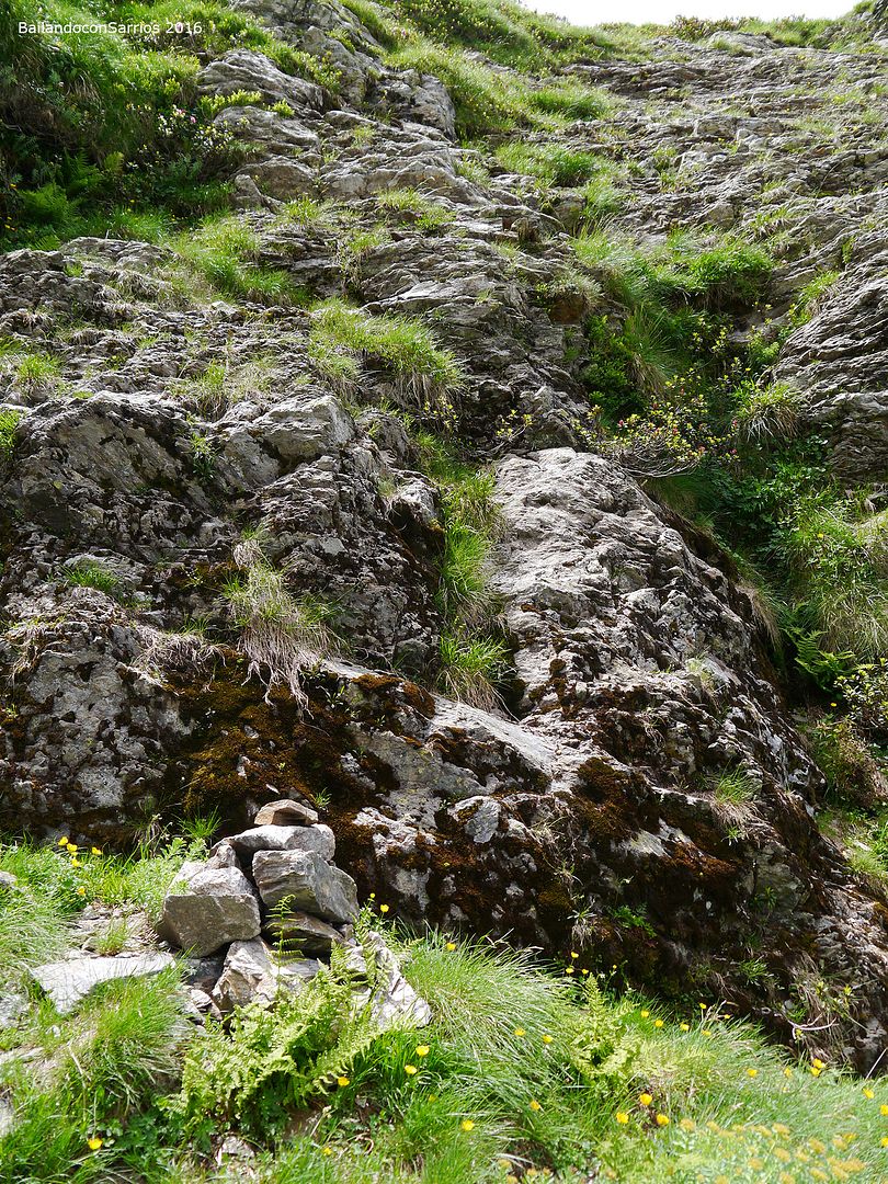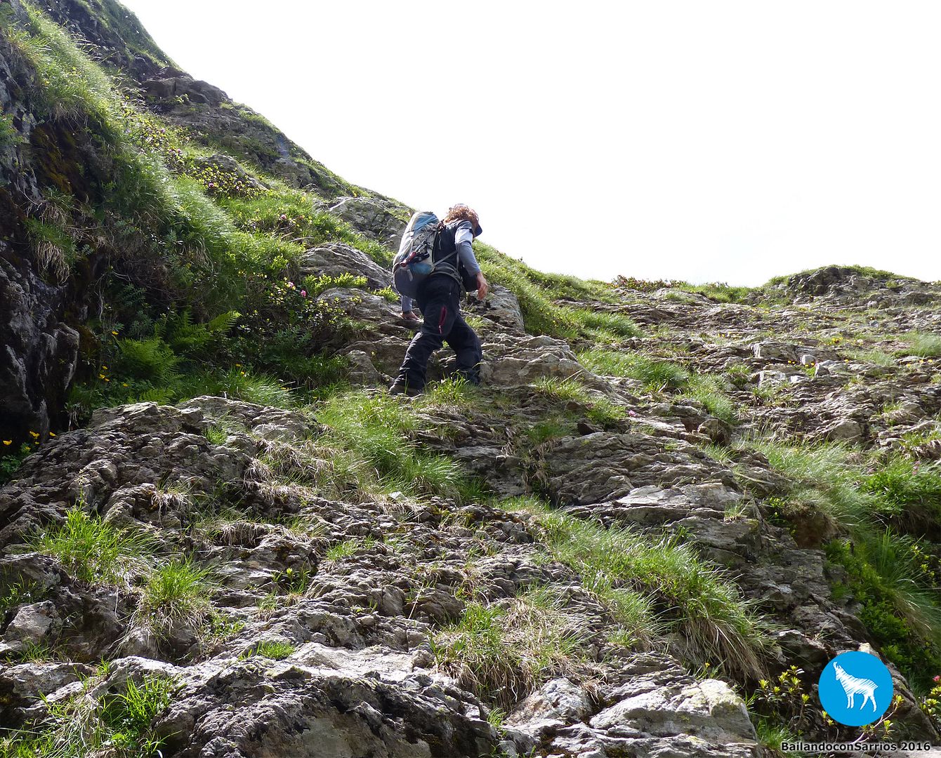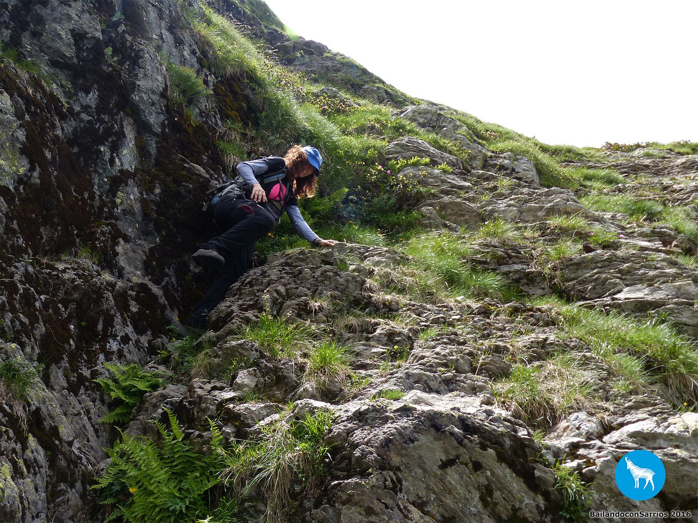 Gracias a nuestra intuición montañera, hemos encontrado el sendero que nos conducirá casi hasta la cima... avanzamos unos metros y por fin visualizamos el primero de los pasos clave de esta ascensión, una trepada sencilla con muchos agarres (grado II), otra historia será si el terreno está mojado.