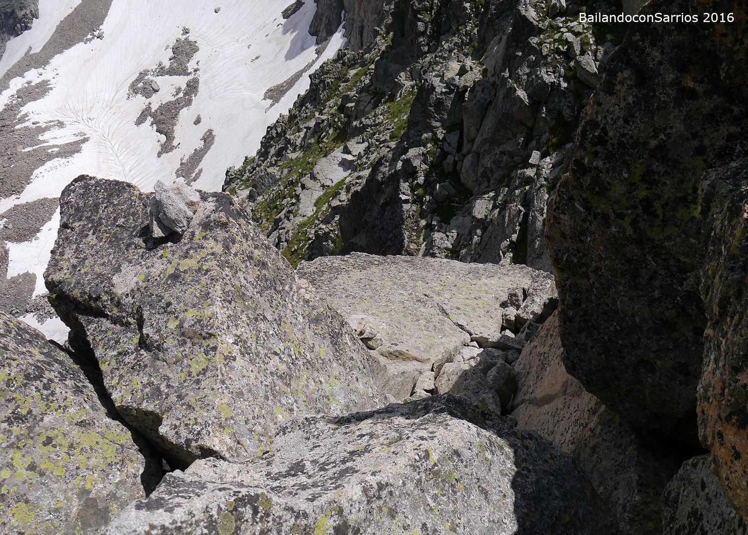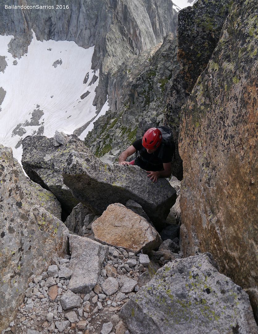 Y por fin, observamos de cerca el famoso bloque cimero del Grand Quayrat, un paso de grado III pulido y con caída a ambos lados, creo que esto se pone interesante... :)