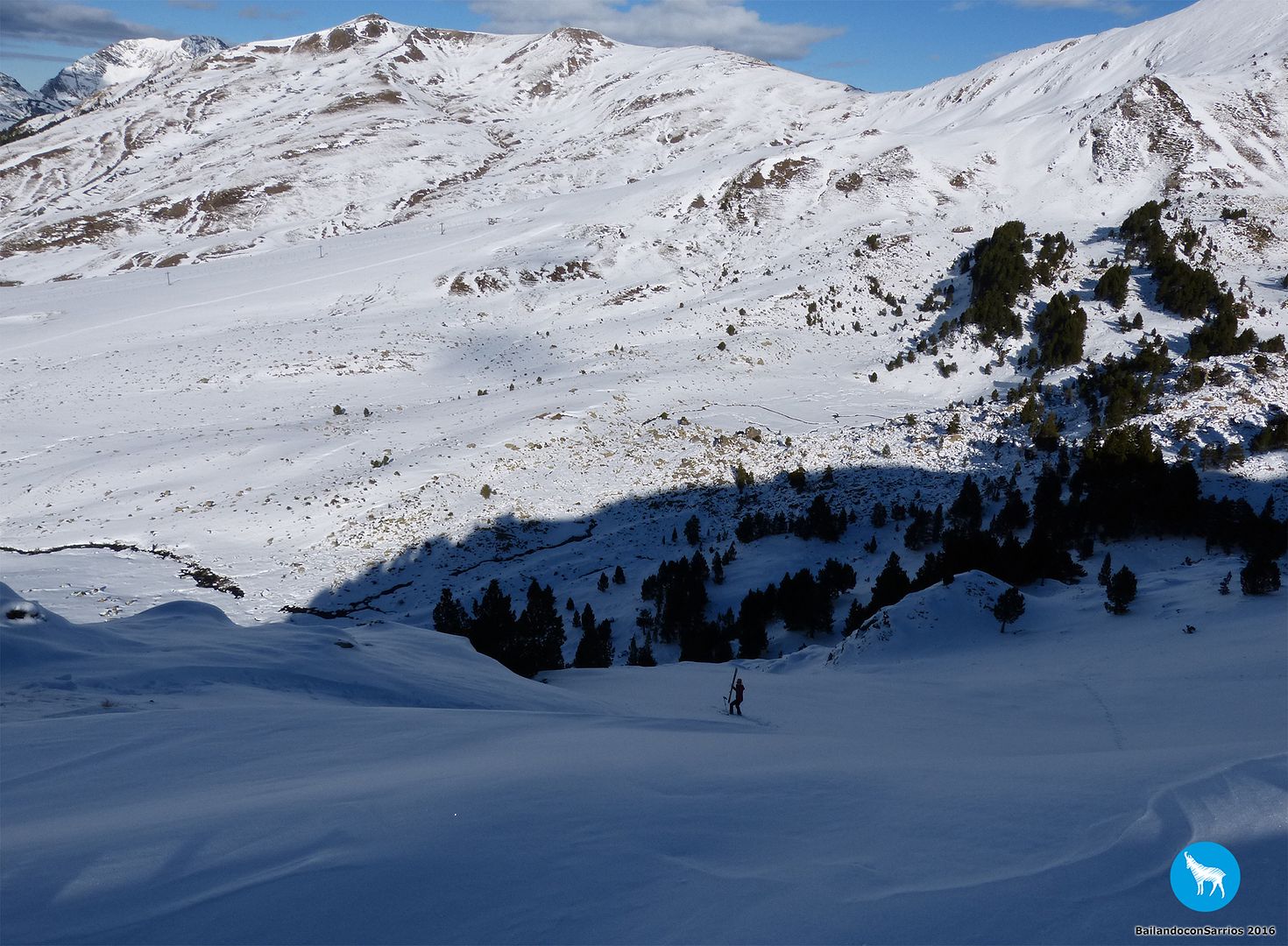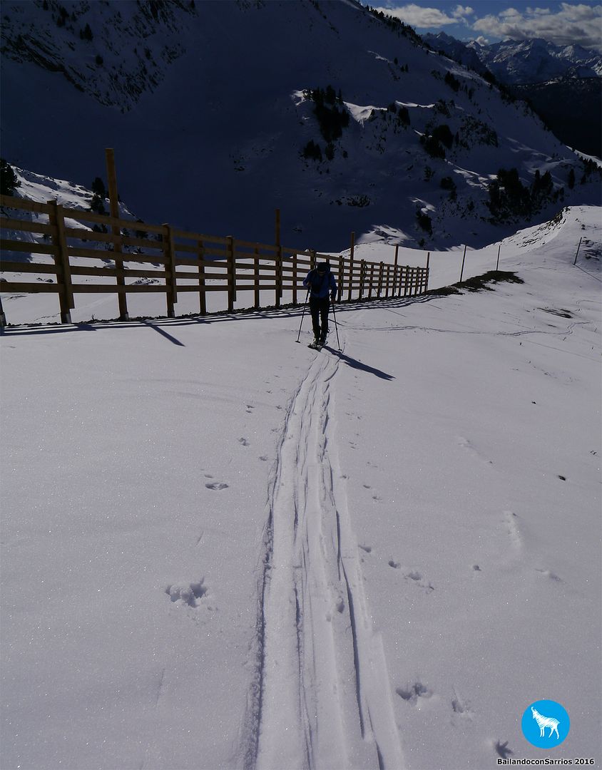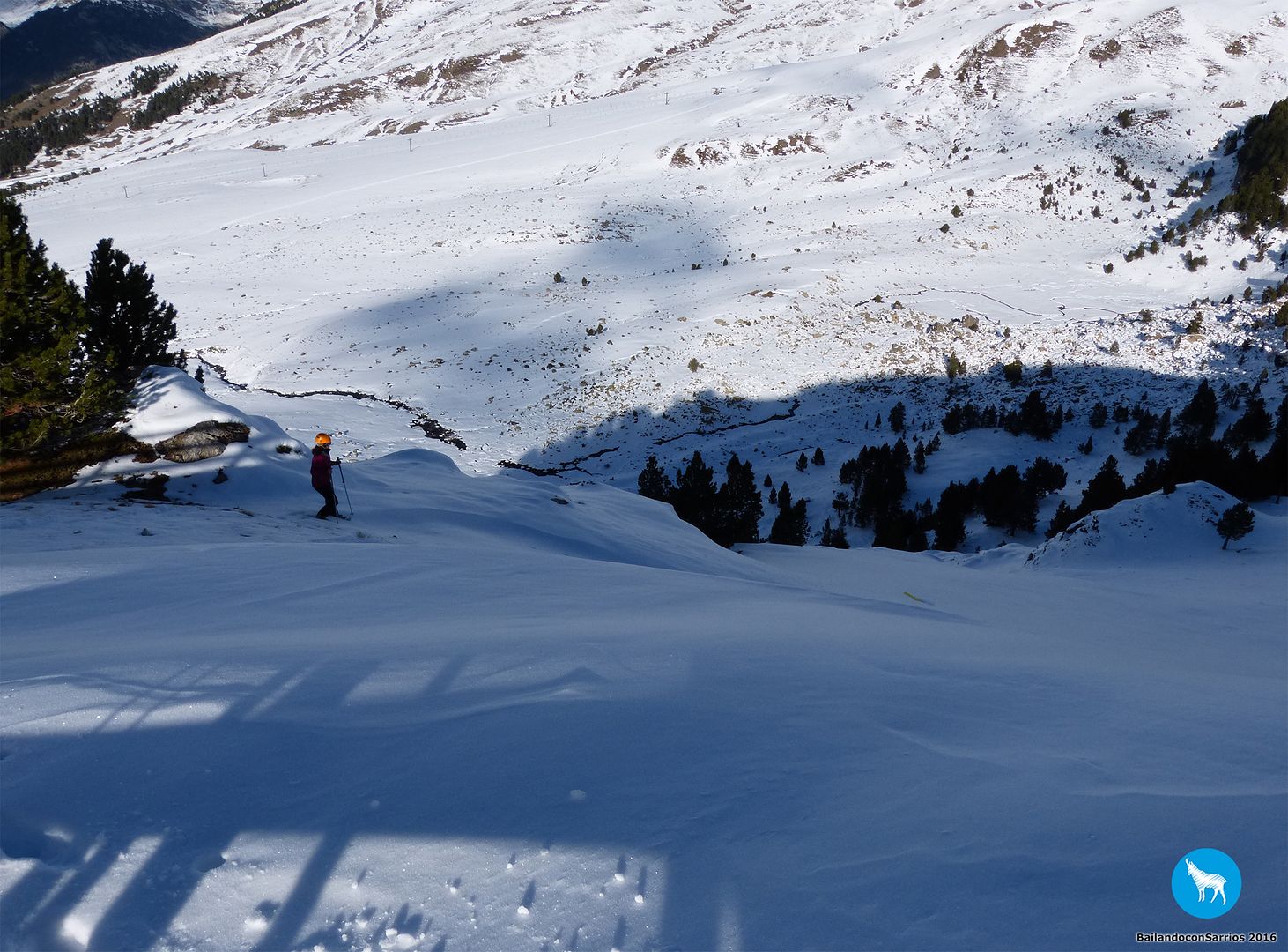 Pasado este tramo, la pendiente disminuye y ya me veo capaz de intentar gestionar el descenso hasta el aparcamiento... la nieve está pesada y me cuesta avanzar pero consigo relajarme y enlazar unos cuantos giros disfrutando como una enana.