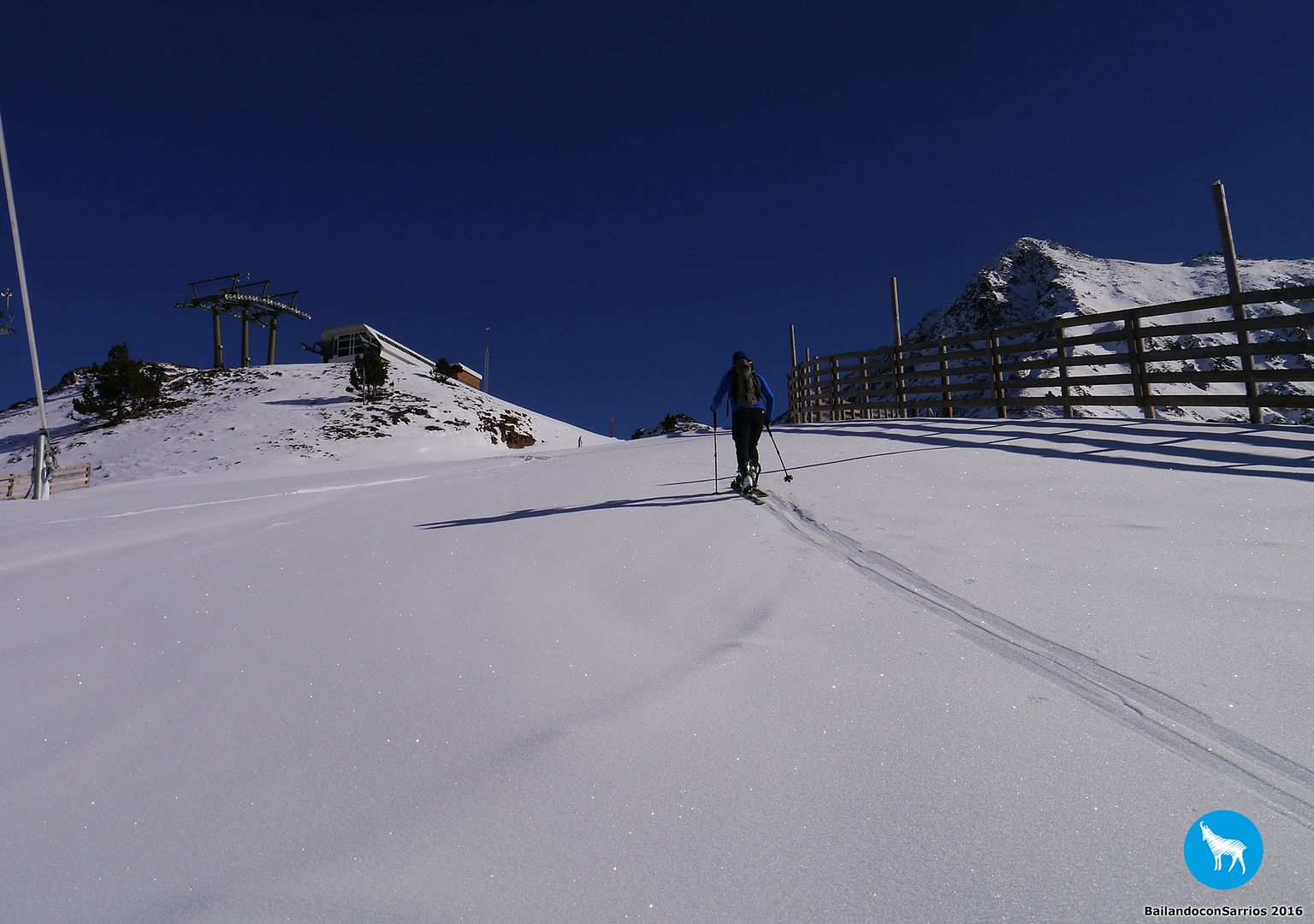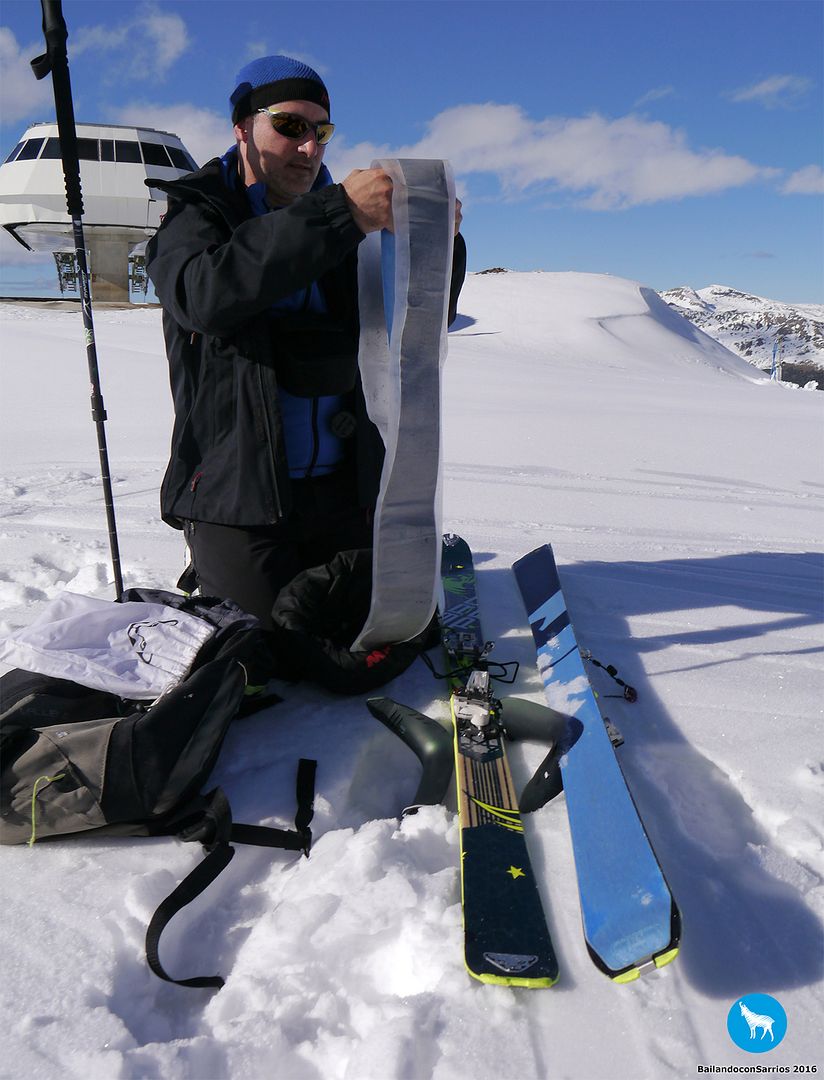 Alcanzamos nuestros esquís y nos ponemos manos a la obra: es hora de quitar focas y, lo peor, de descender hasta el punto de partida con mi nivelazo de esquí y por las pistas sin pisar... :O