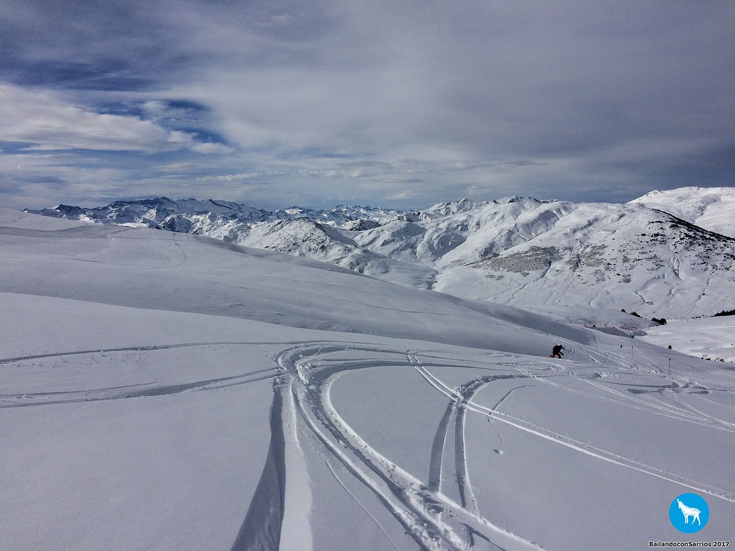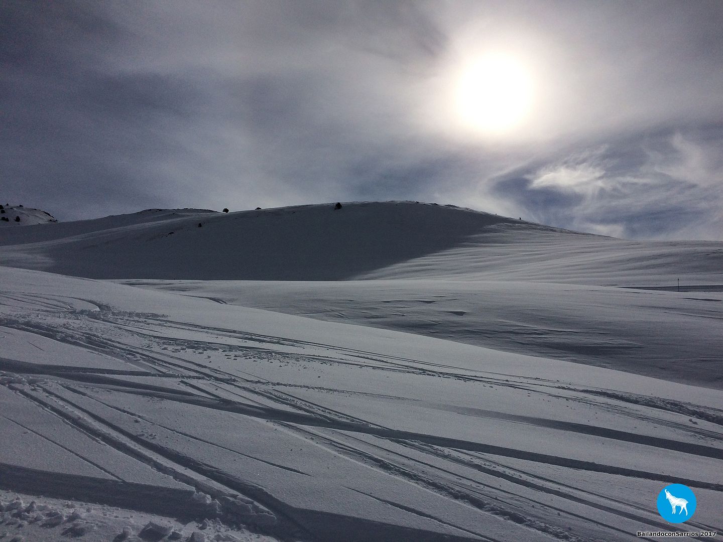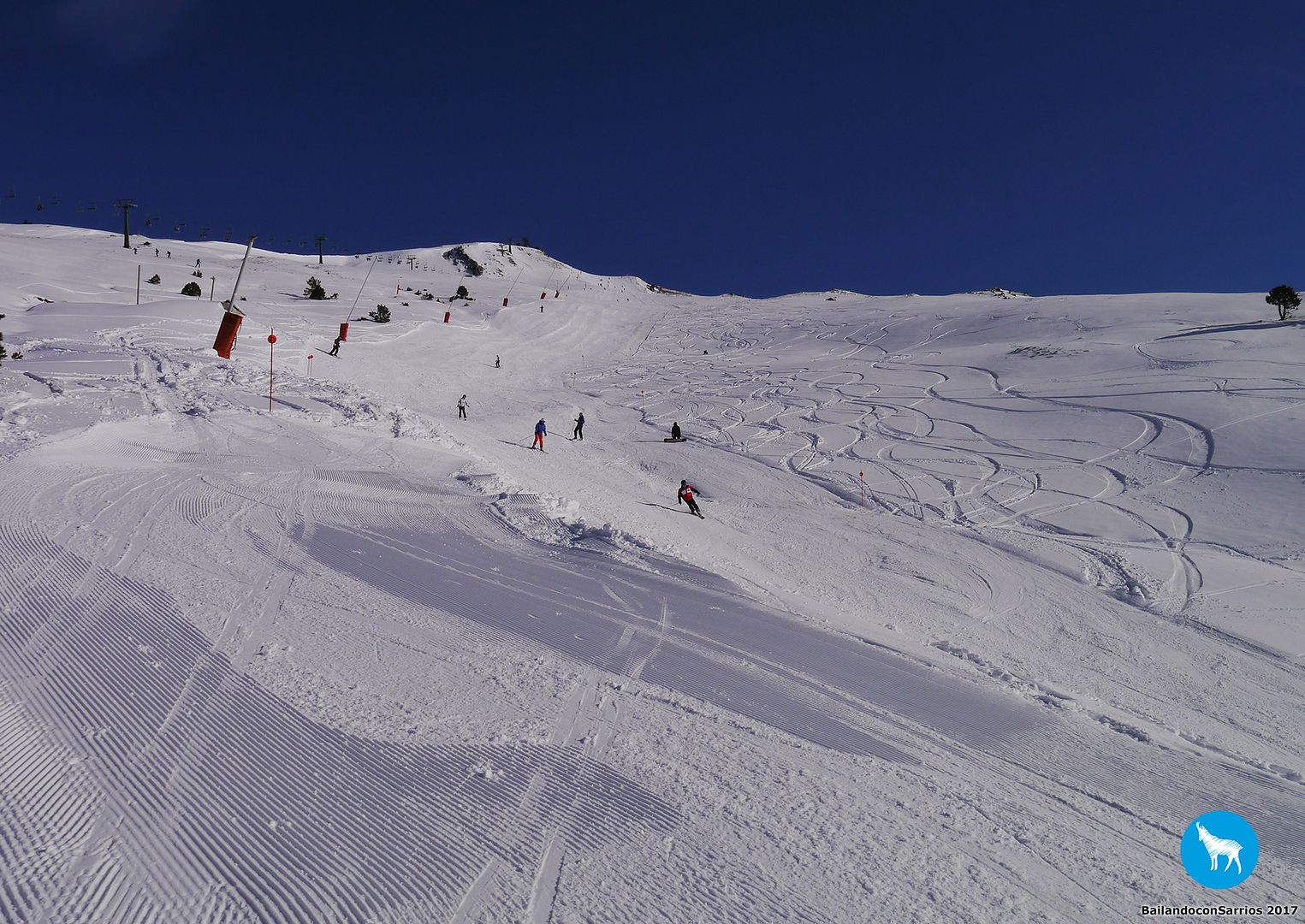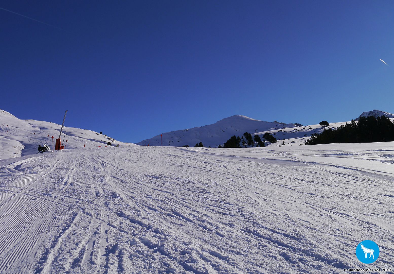 Voy enlazando unos cuantos giros con muy buenas sensaciones por lo que, unos metros más abajo, le propongo a Martín salirnos de la pista y esquiar un poco por nieve virgen (!!!)... Martín me mira y se carcajea, veremos lo que tardo en caerme.