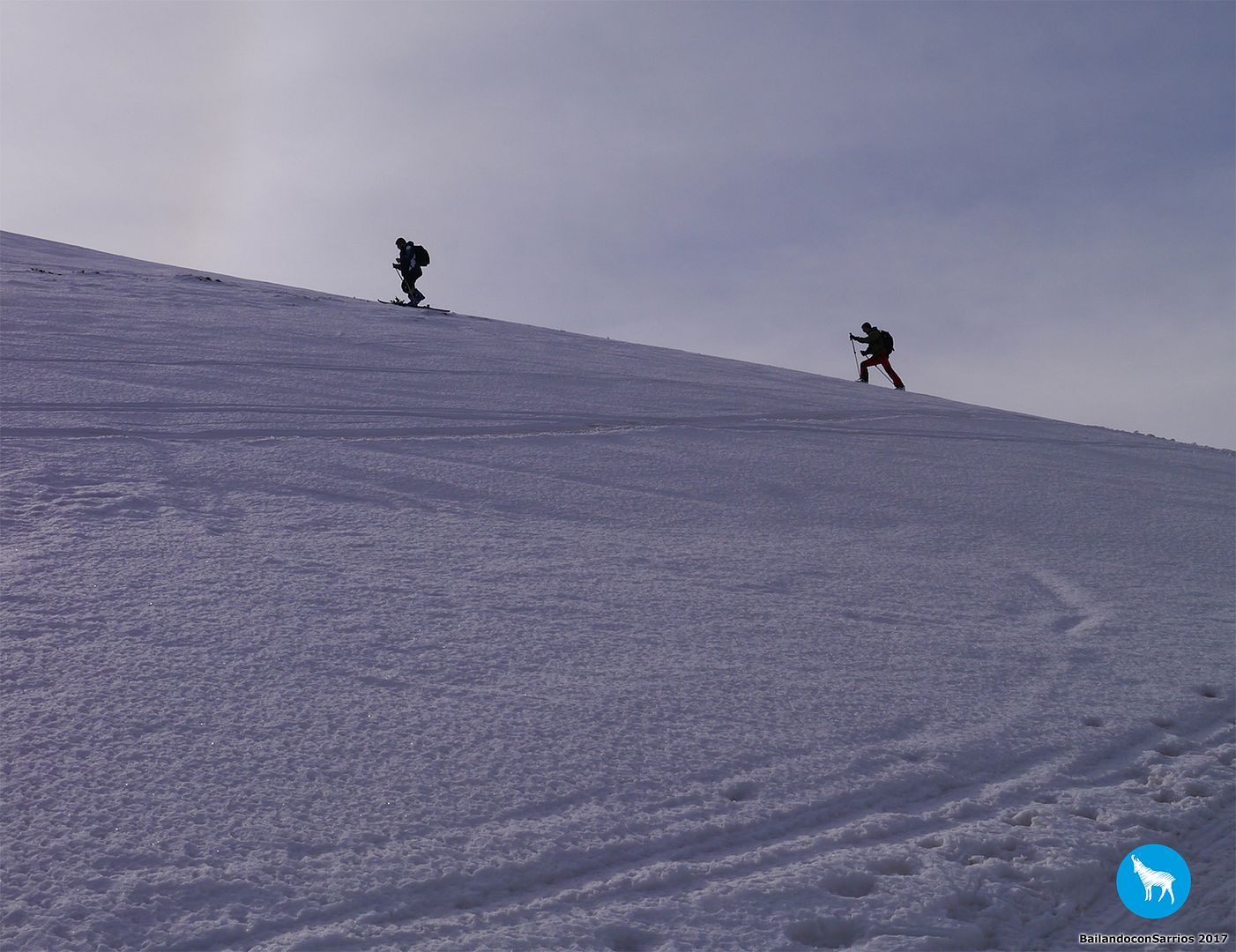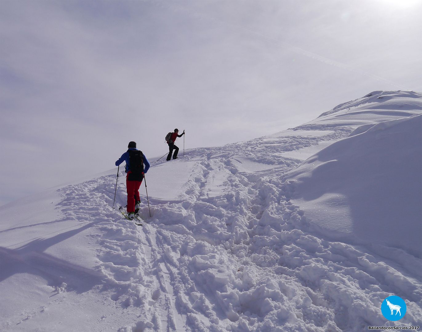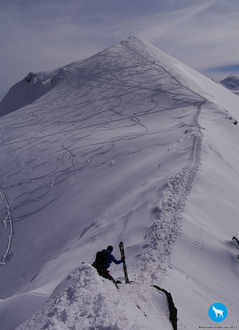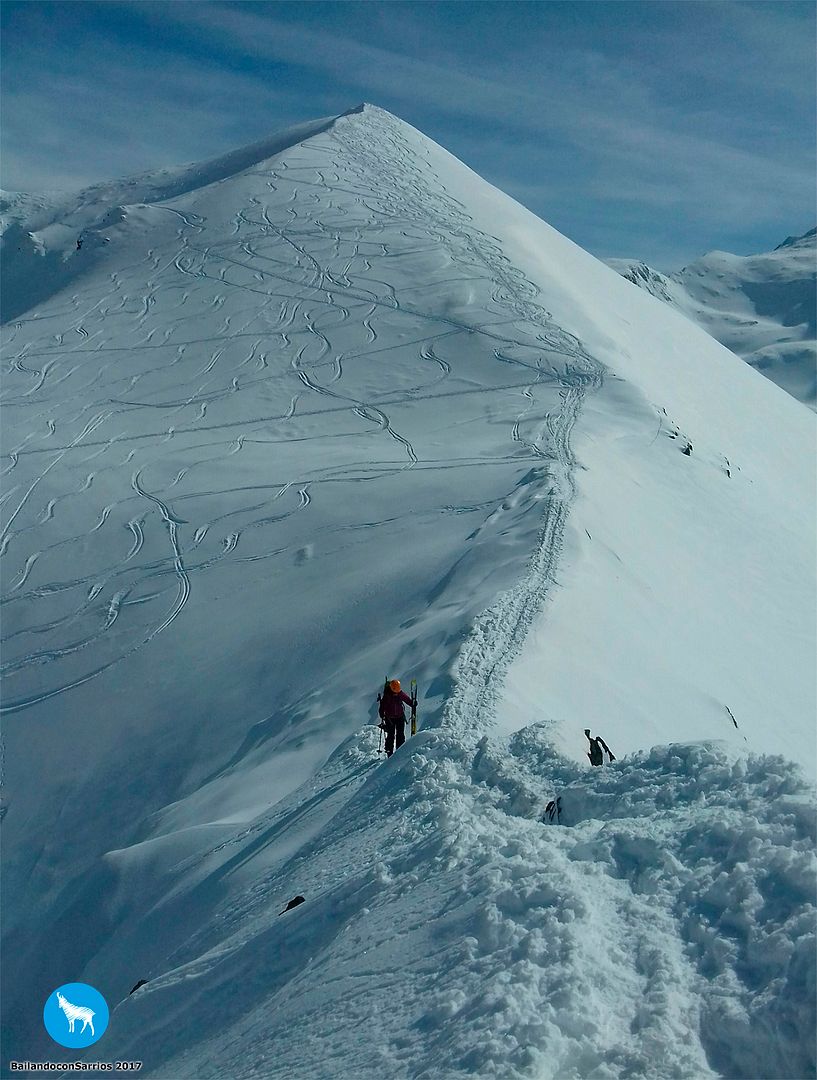 Y llegó la hora del descenso... Martín comienza a bajar y me dice que la nieve está un pelín complicada para mi nivel (!!!)... los primeros metros los gestiono como puedo, mirando de reojo la caída a ambos lados, verás como me descontrole... :O