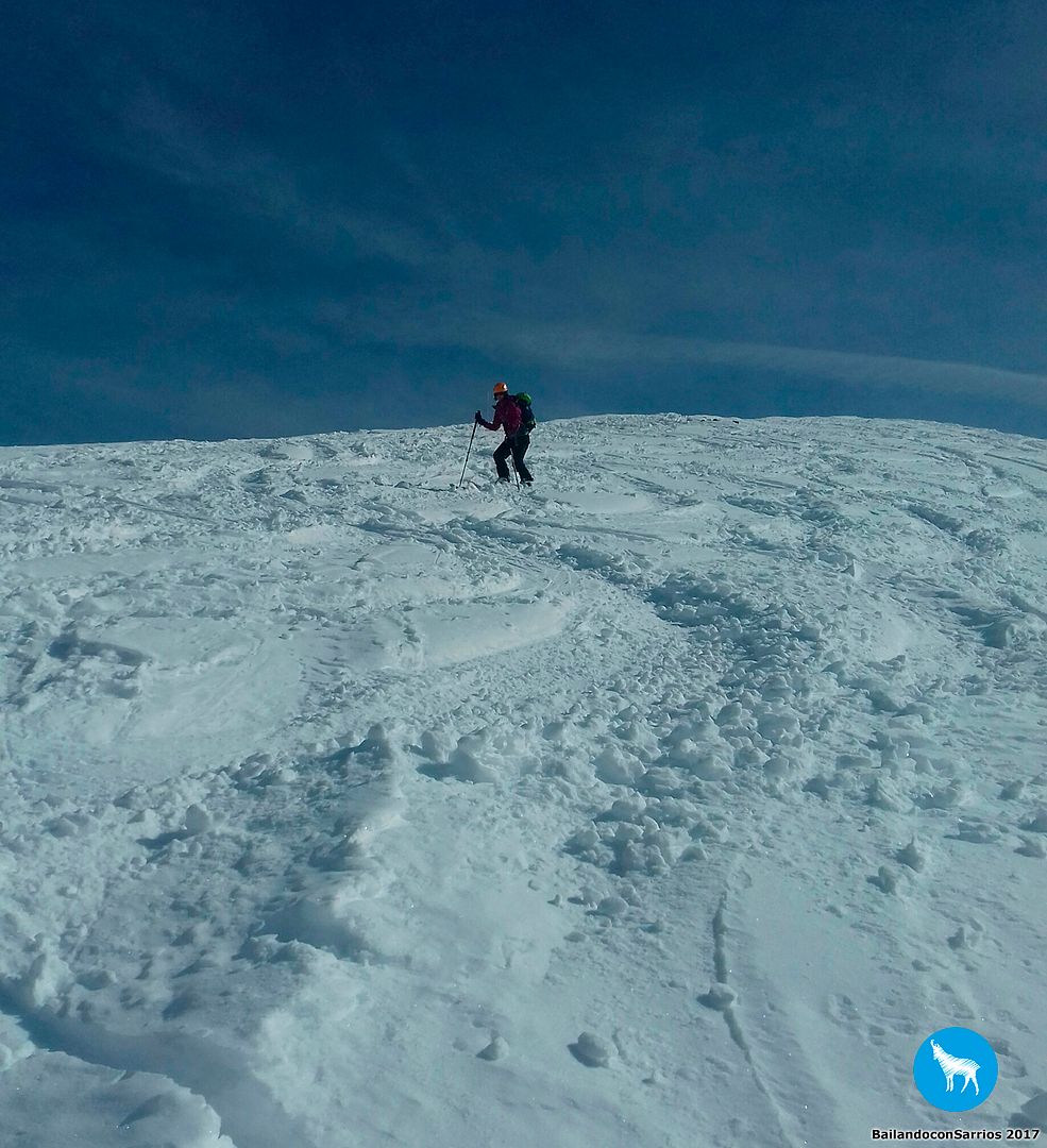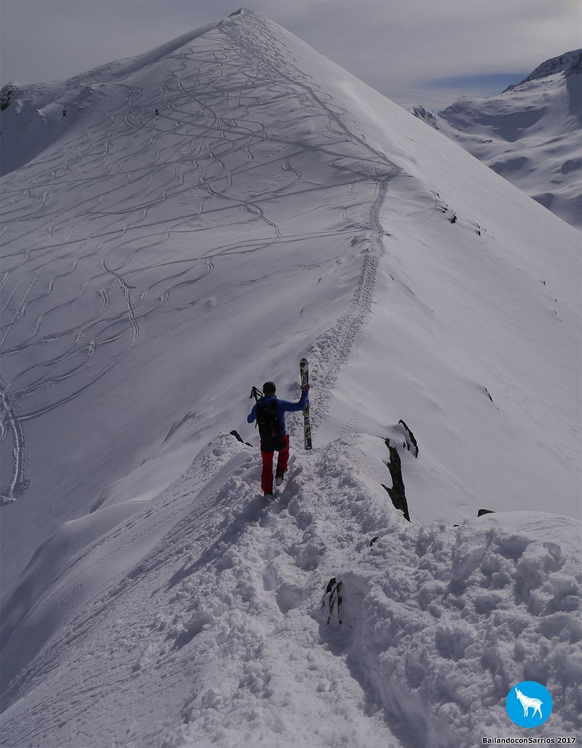 Y llegó la hora del descenso... Martín comienza a bajar y me dice que la nieve está un pelín complicada para mi nivel (!!!)... los primeros metros los gestiono como puedo, mirando de reojo la caída a ambos lados, verás como me descontrole... :O