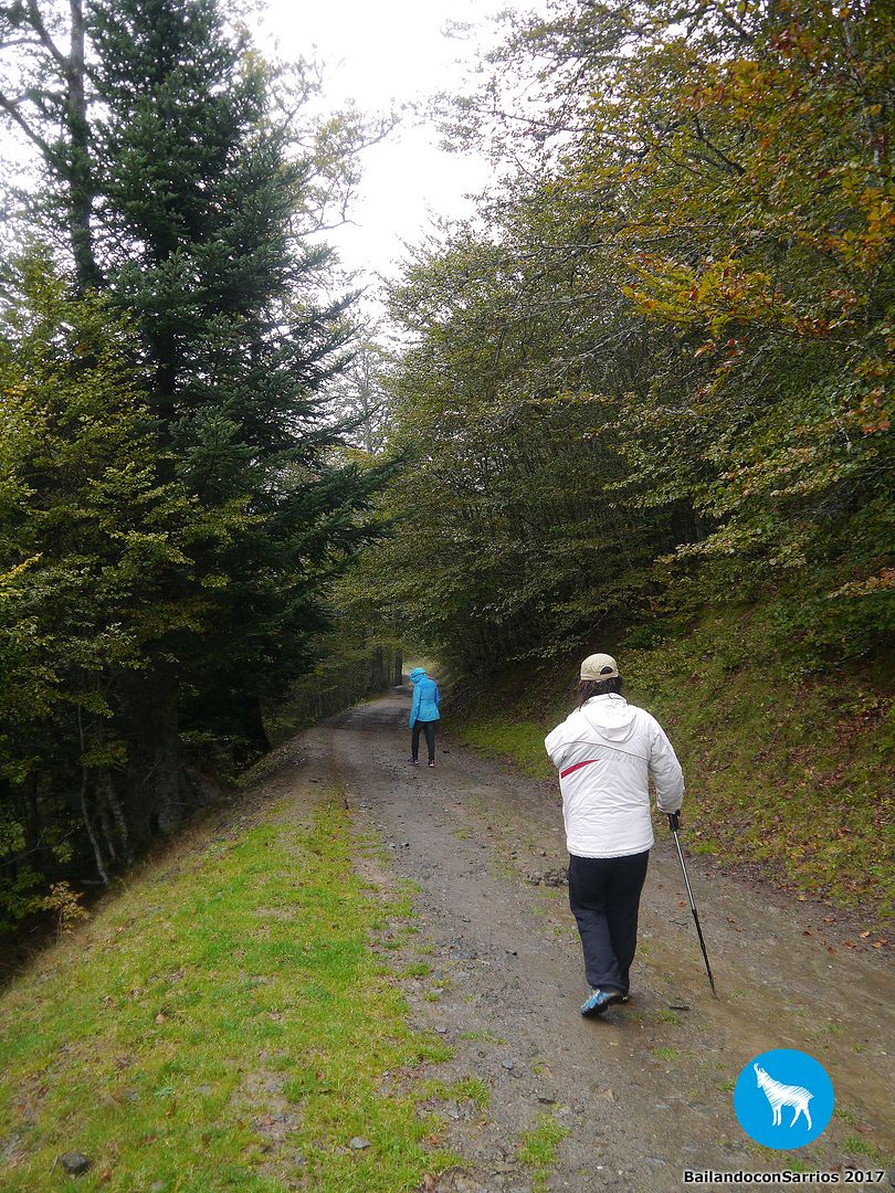 Ya en el espectacular bosque de coníferas y frondosas, totalmente empapados.