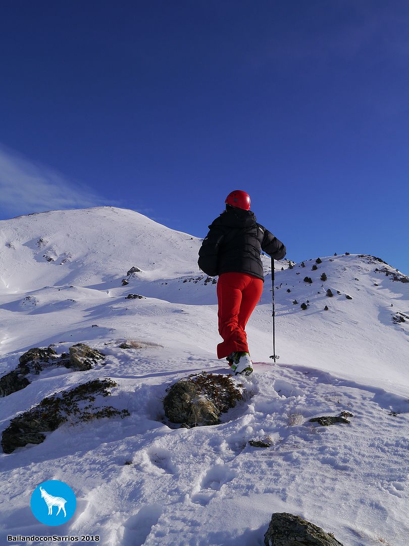 Destrepamos con cuidado y llegamos hasta nuestras tablas... Martín me comenta que, si no lo veo claro, que descienda a pata hasta la pista mientras él me las lleva pero yo le comento que quiero intentarlo... quitamos las focas y acoplamos las botas en las fijaciones de las tablas para comenzar a bajar.
