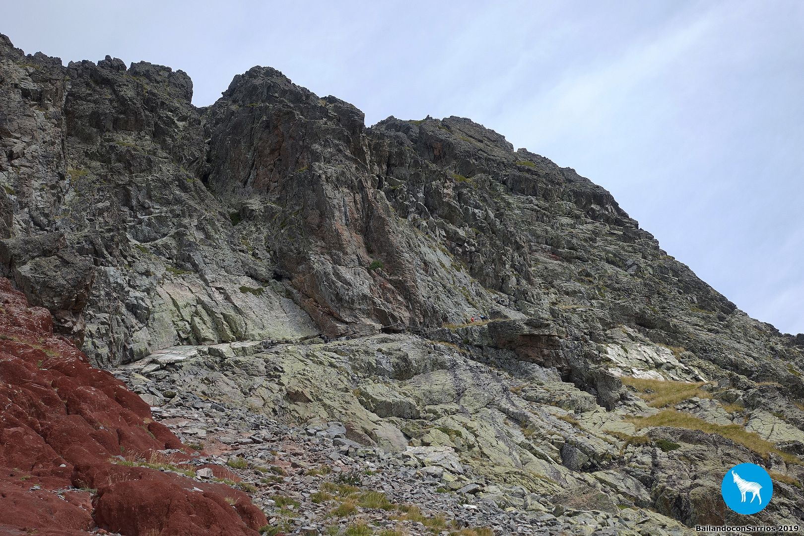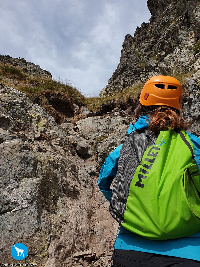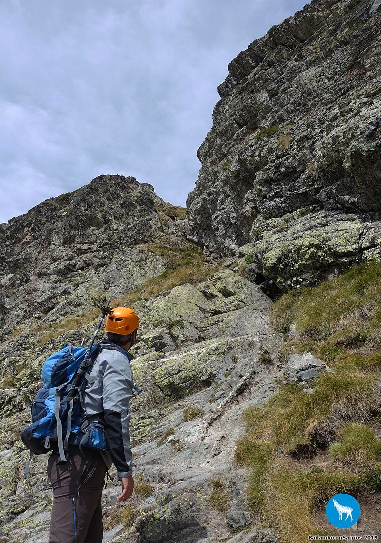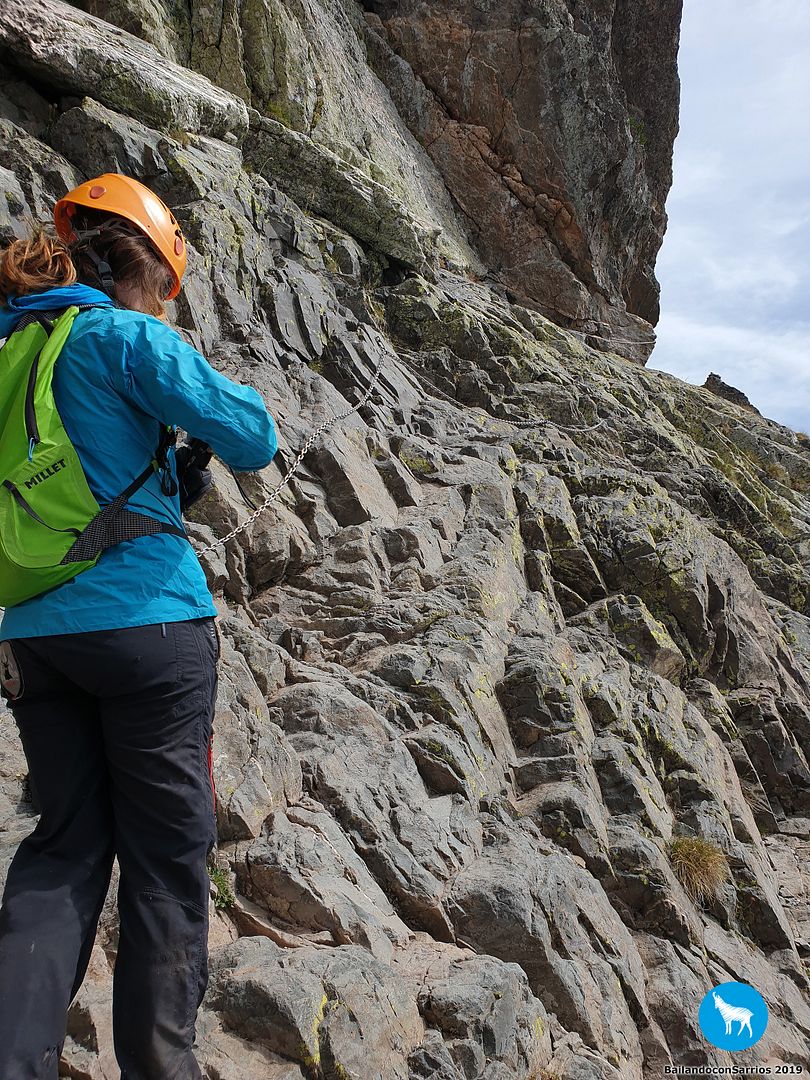 Pasos de trepada de grado II entre el Collado de Anayet y la cima del Pico Anayet, la primera parte equipada con una sirga y la segunda una canal-chimenea con múltiples presas y puntos de apoyo.